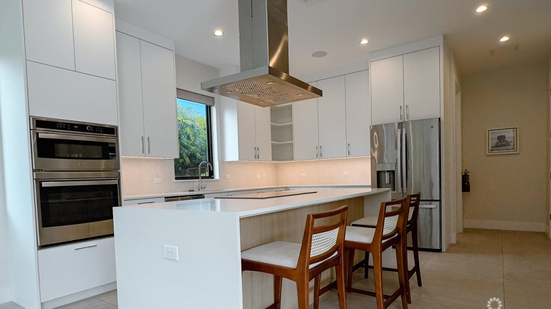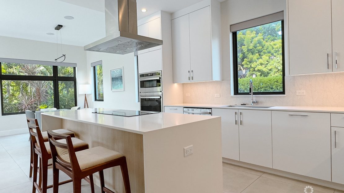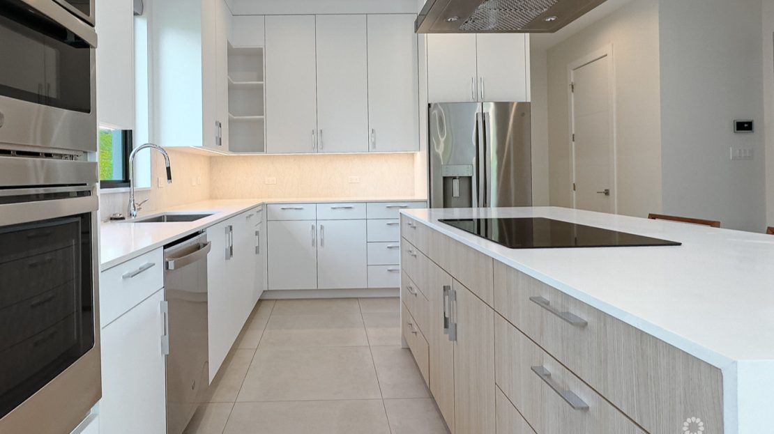 At the heart of the home, the kitchen combines function and elegance. Top-of-the-line appliances, custom ceiling-high cabinetry, and waterfall-edge quartz countertops make this space a showpiece for culinary creativity. Porcelain tile flooring adds a layer of durability while maintaining the home’s polished aesthetic.