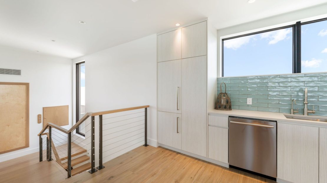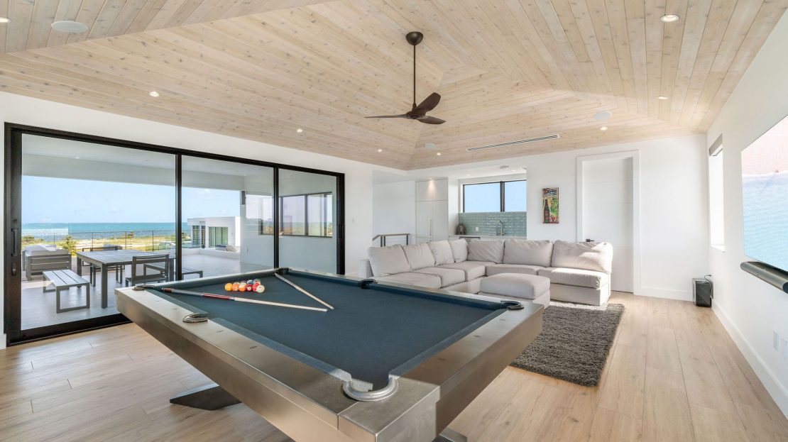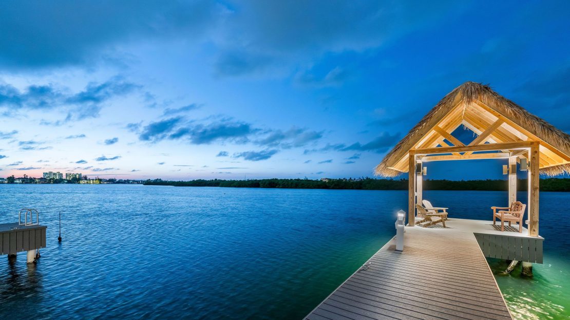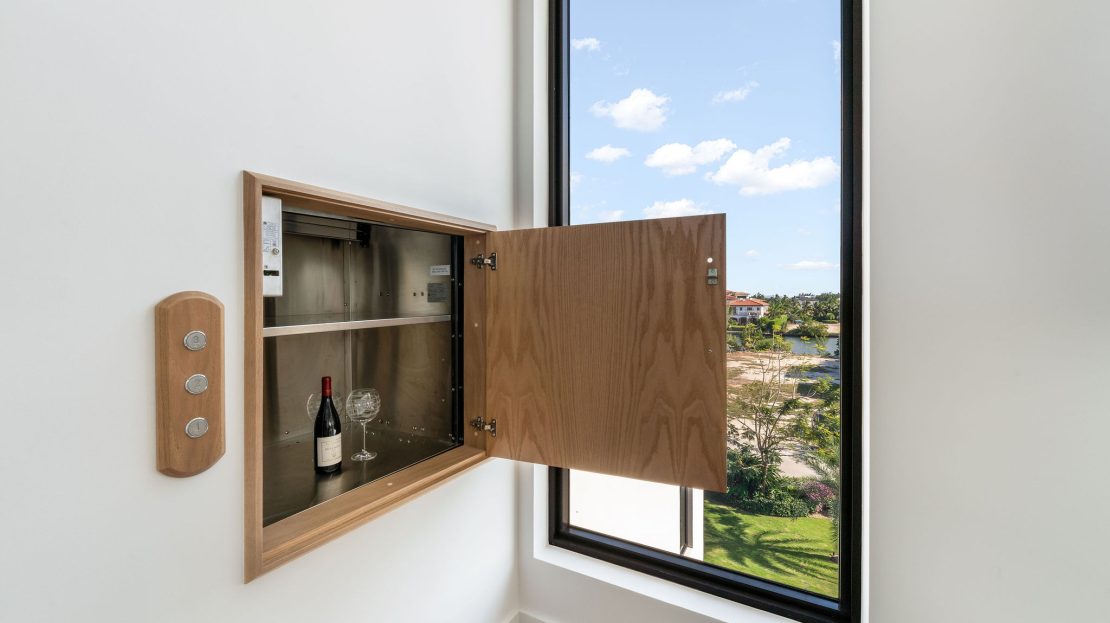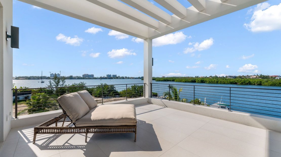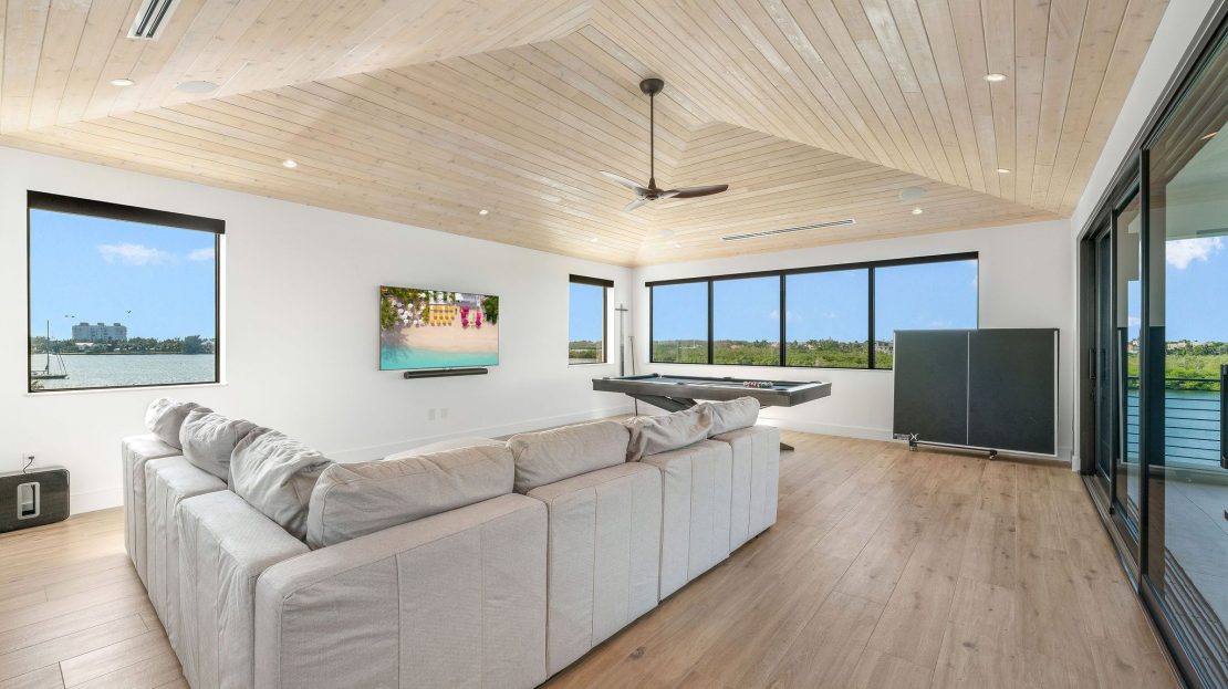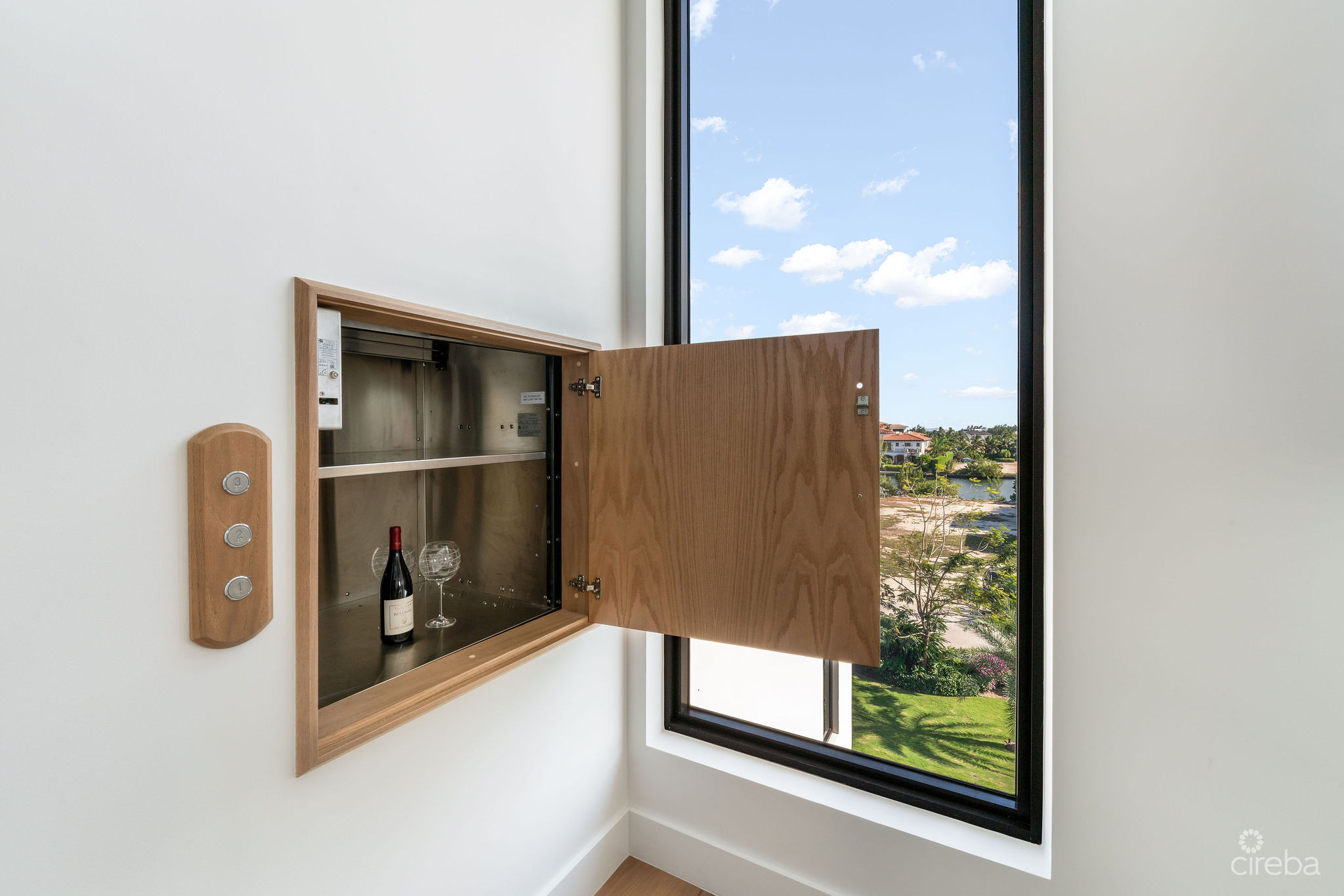 The upper level features a dedicated entertainment space with a kitchenette, full bathroom, and dumbwaiter, and offers a panoramic-view terrace perfect for sunsets over the water.