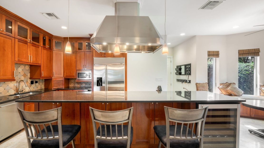 The first floor has an open plan living area which boasts 10 foot ceilings and a large living room and dining room that flow into the kitchen. The kitchen includes a large Island with seating for 3, and stainless steel Monogram appliances, a gas cook top, and a wine refrigerator.
