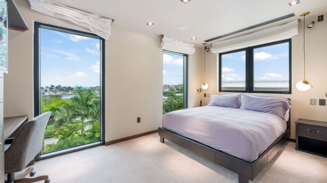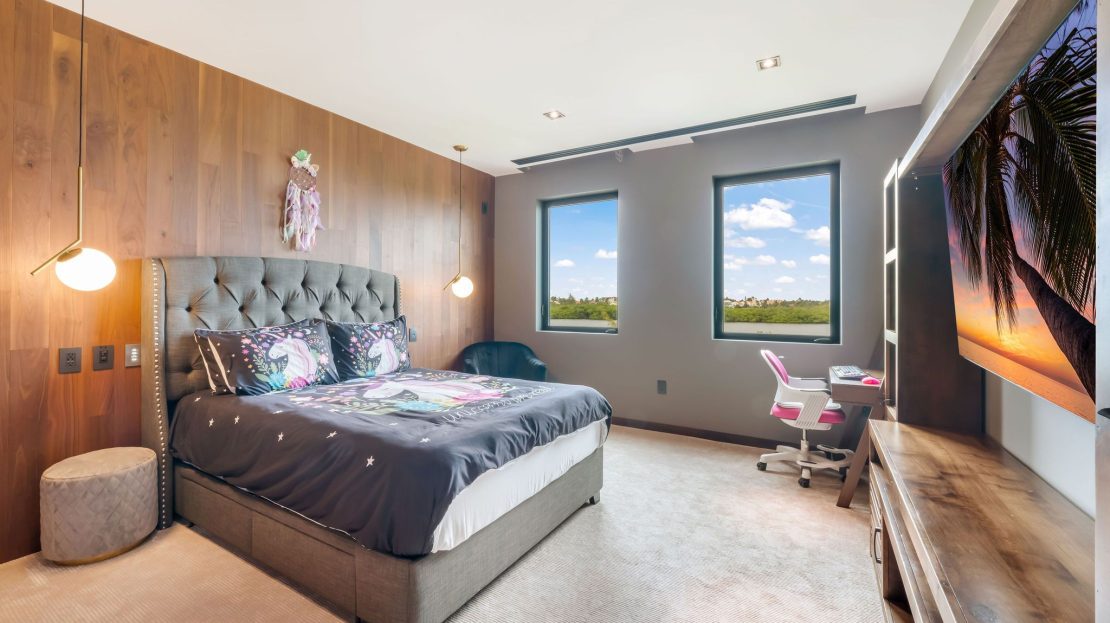 The master suite occupies its own wing of the home, offering a serene retreat complete with a spa-like ensuite bath, walk-in closet, and private terrace overlooking the azure waters beyond. Additional guest suites, each appointed with luxurious finishes and private baths, ensure comfort and privacy for family and friends.