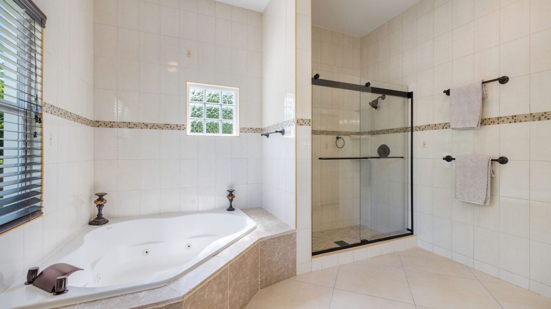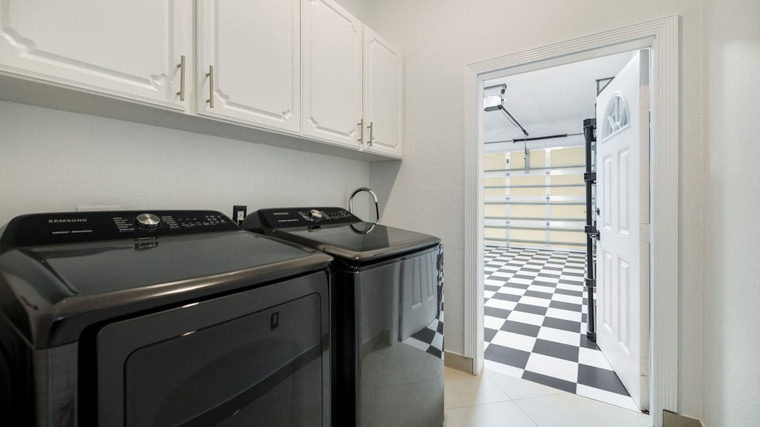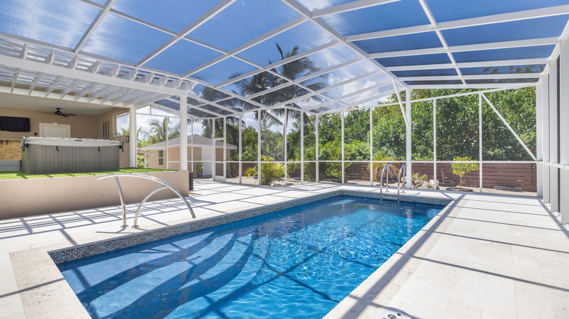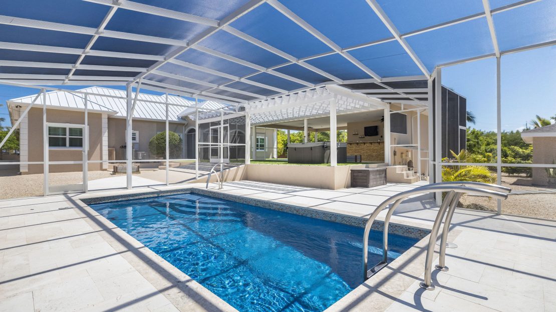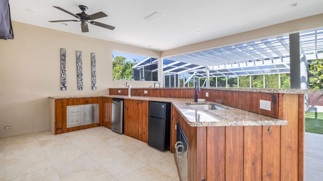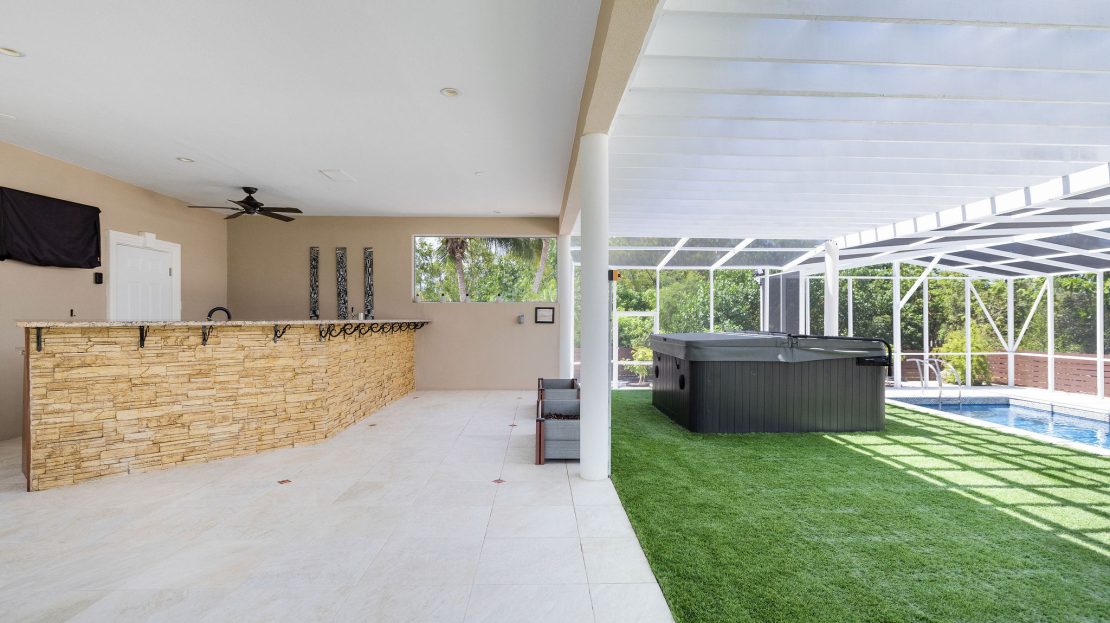 Slide open the glass doors to a fully screened saltwater pool glowing with color-changing LED lights, where you can lounge on the sun shelf, grip the sleek modern rails, or sink into the 6-person hot tub spa under the stars; the private outdoor bar pavilion is an entertainer’s dream with a built-in kegerator, full fridge, Bluetooth surround sound, outdoor TV, full poolside bathroom, and artificial green turf flowing seamlessly from the covered lanai to the bar and spa for zero mud and zero mowing.
