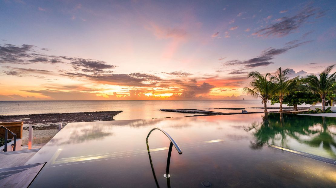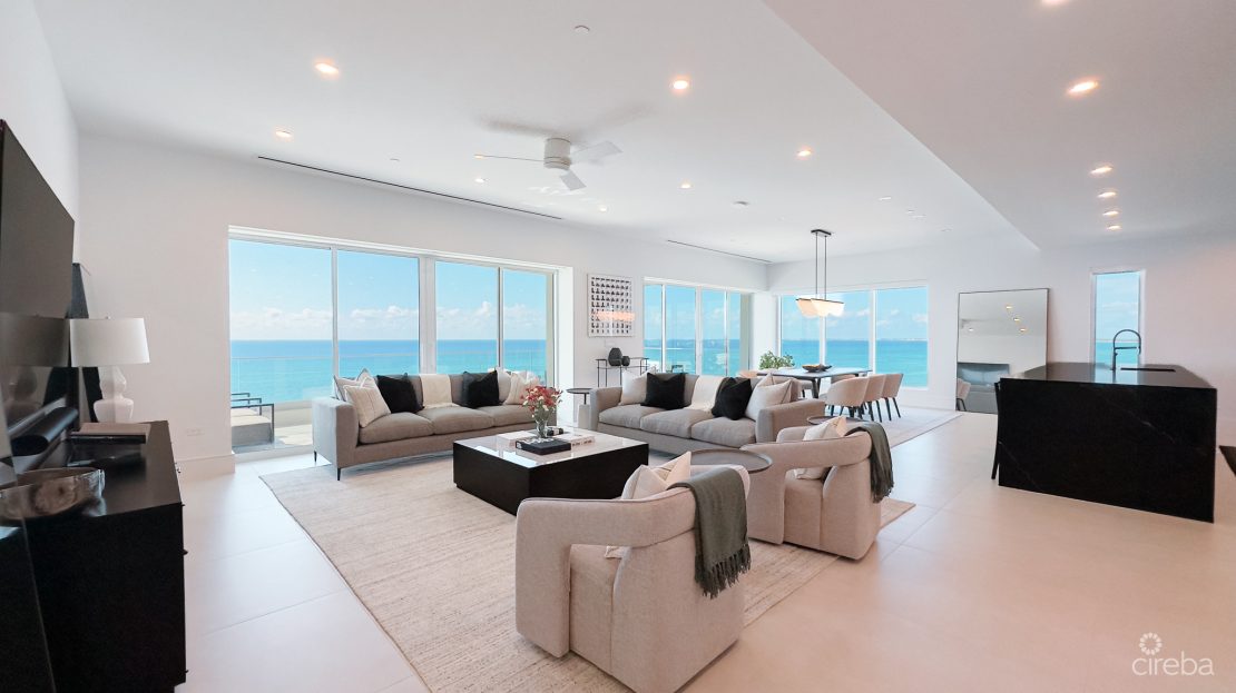 Occupying the entire 7th floor, with 360-degree panoramic views, this residence boasts an impressive 50-foot-wide beachfront terrace, offering ample space for entertaining and dining while enjoying the breathtaking views of Seven Mile Beach and its stunning sunsets.