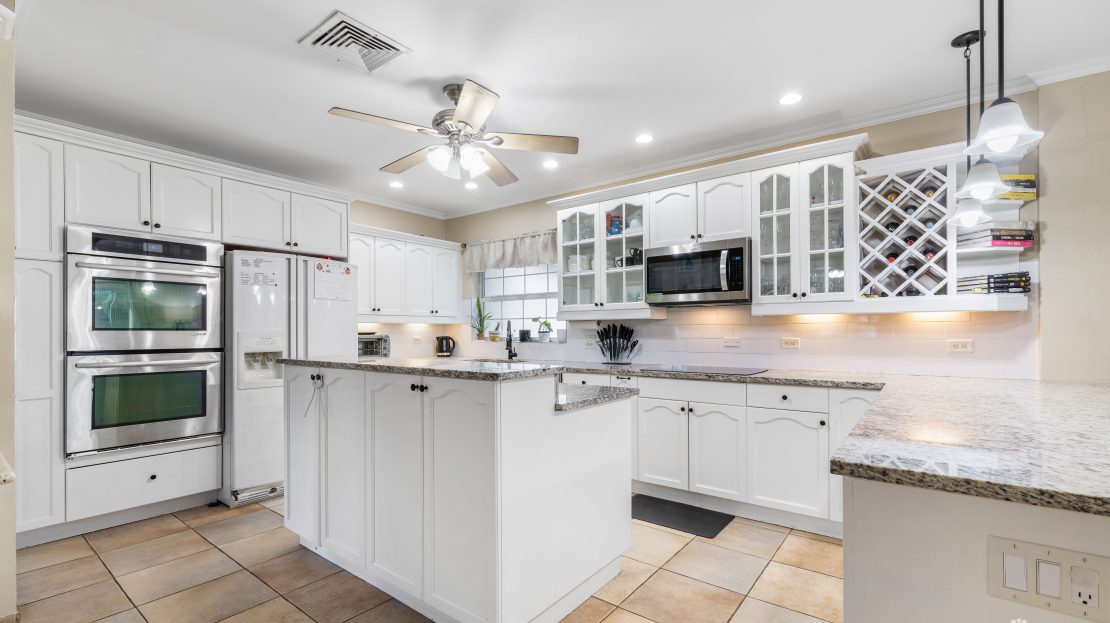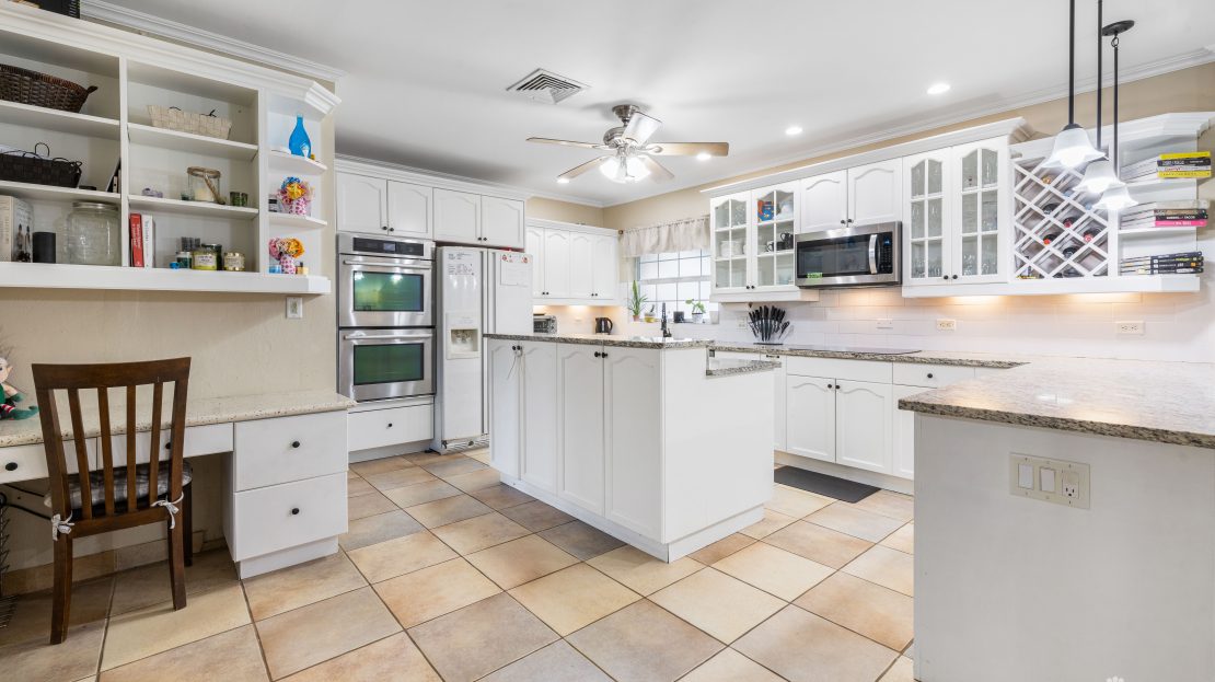 -The bright and airy kitchen boasts wood cabinetry, generous workspace, and a cozy breakfast/den area perfect for casual meals.