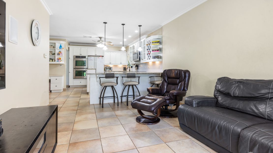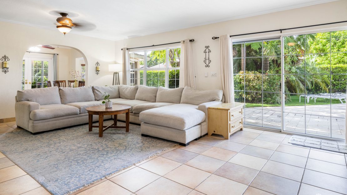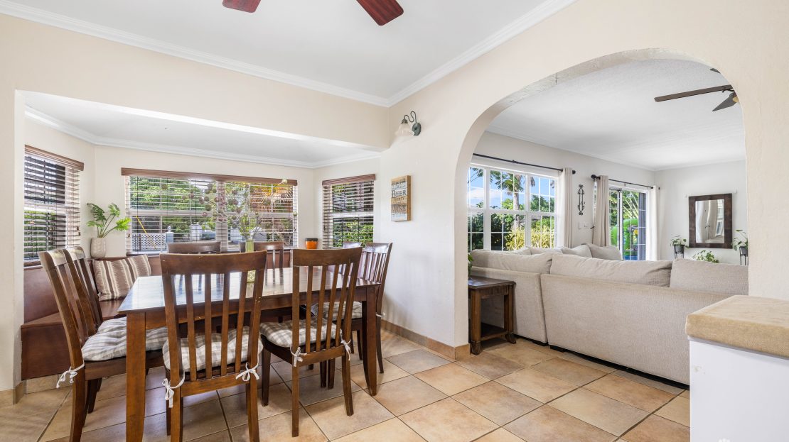 -A dining room features a custom built-in banquette, flowing effortlessly into a spacious living room and onto the patio and pool area.