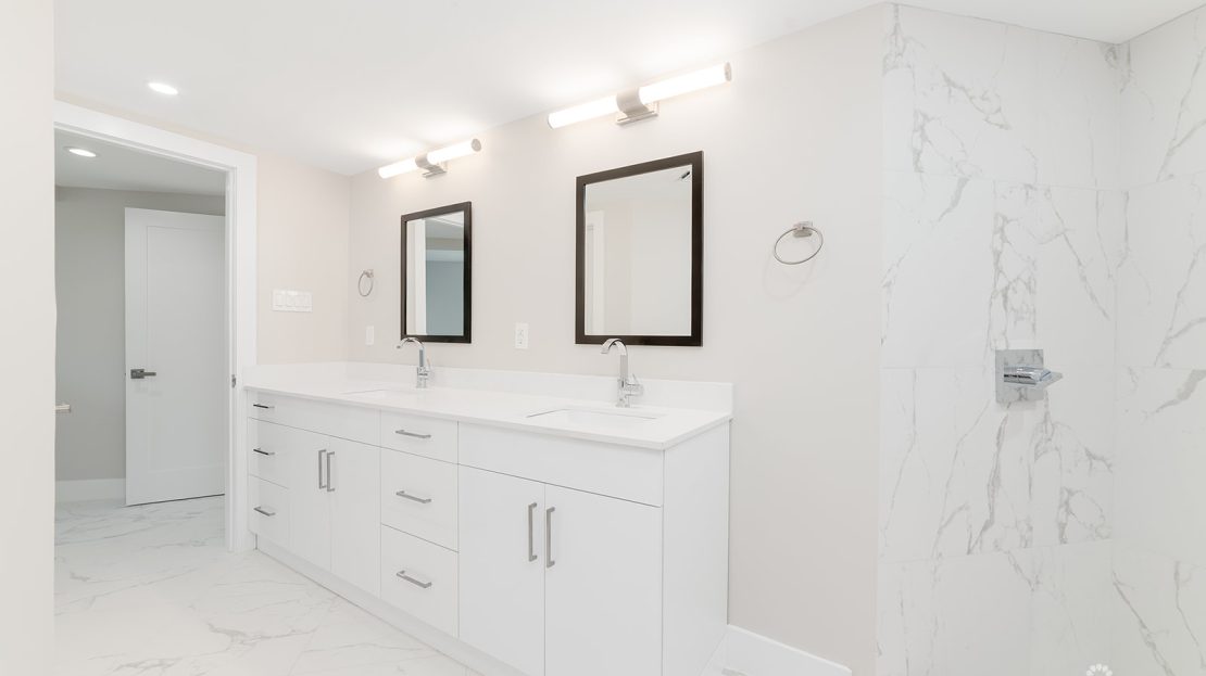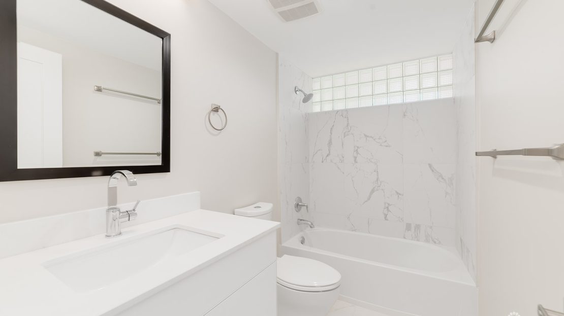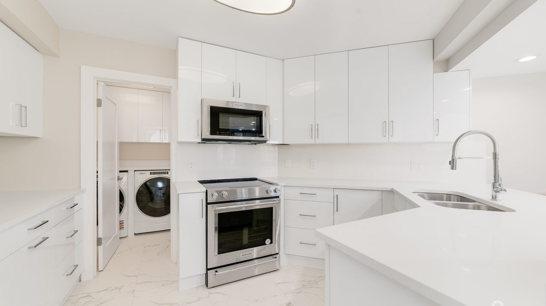 Inside, no detail has been overlooked. The chef’s kitchen features white quartz countertops, pearl-finish cabinetry, and top-of-the-line appliances, making it both functional and stylish. Adjacent is a sleek laundry closet with a quartz countertop for added convenience.