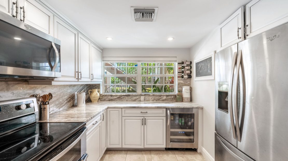 Inside, the contemporary kitchen features elegant cabinetry, modern appliances, and quartz countertops, flowing into the living and dining area. The spacious bedroom offers a calm retreat with garden views, generous storage, and a stylish, newly updated bathroom.