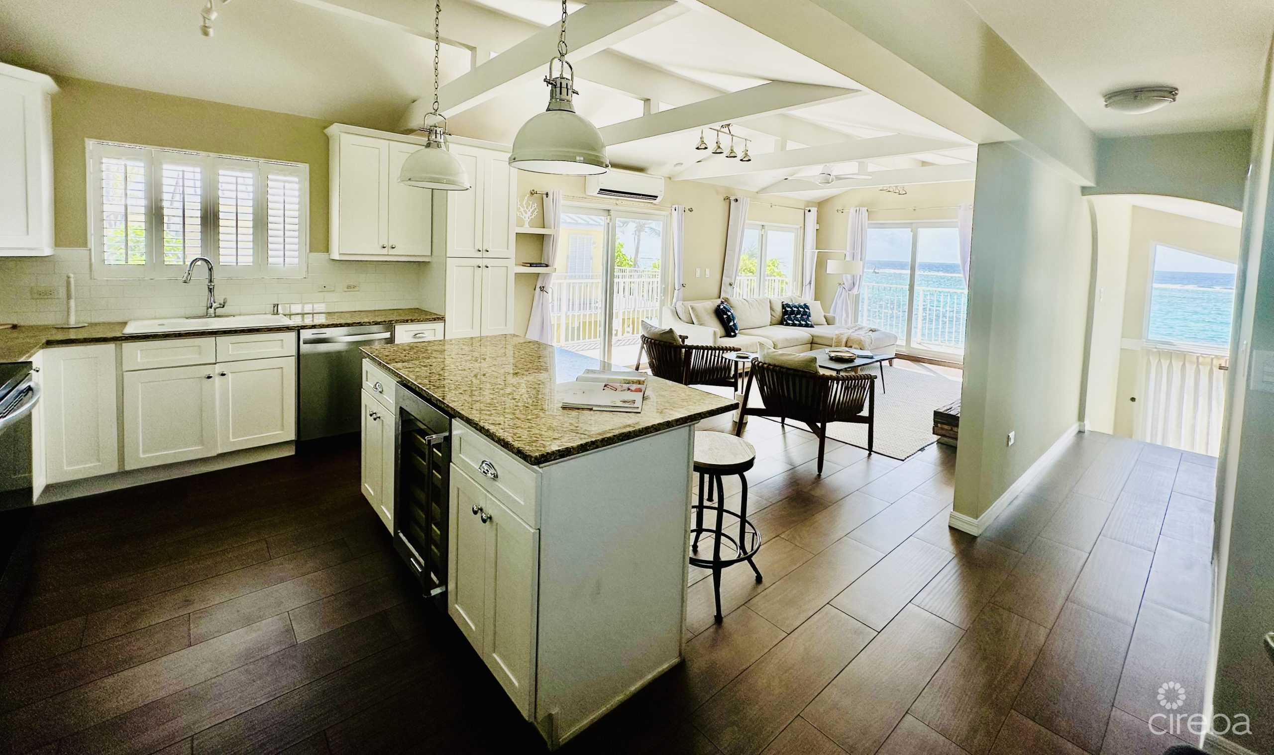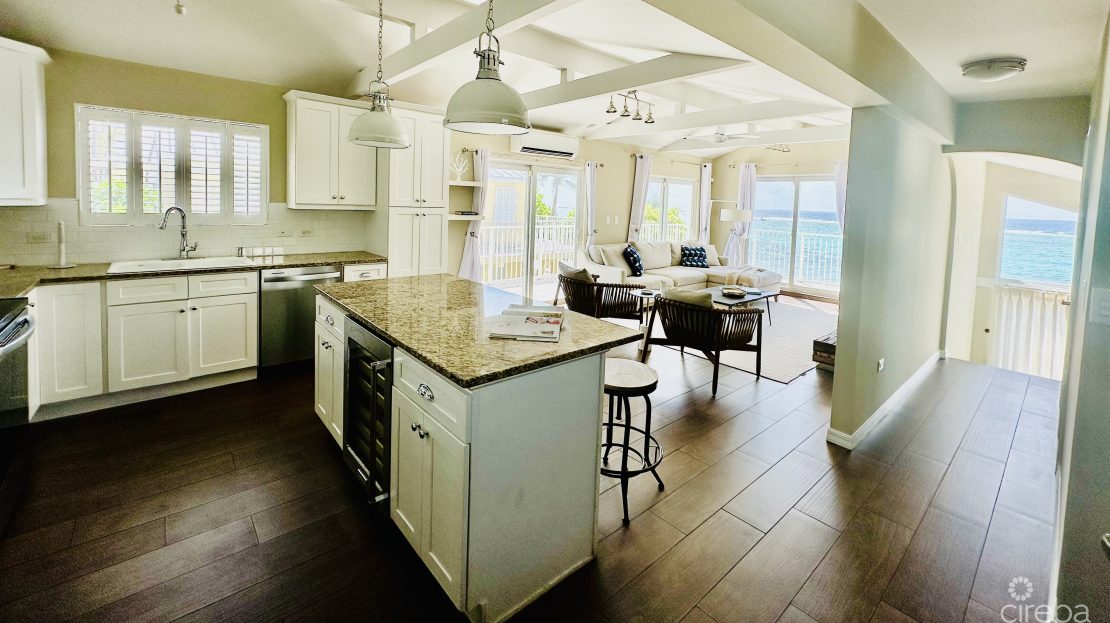Escape to your own Beachfront Cottage at Caribbean Paradise in South Sound. A stand alone home with expansive deck and exquisite sea views, where you can hear the water as it laps the shore and enjoy the sea breezes. This truly is your Caribbean Paradise come true! This stunning 3-bedroom + office + den, is a multi-level renovated home and perfect for any couple or family. Beachfront living, nestled in a safe, family-friendly neighborhood, offering the ideal blend of luxury, comfort, and charm.