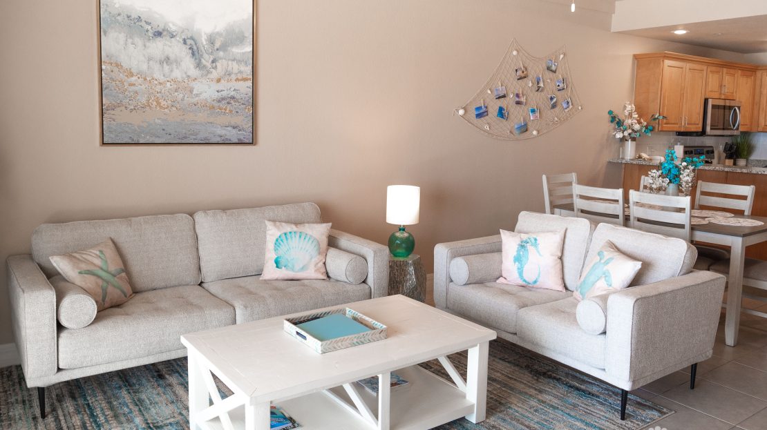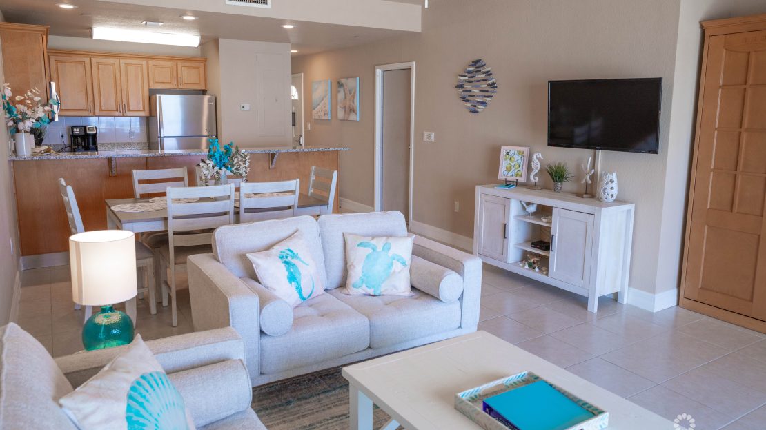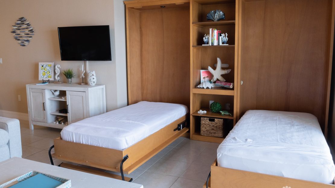 This spacious two-bedroom condo is designed with flexibility in mind. One bedroom can be fully locked off, allowing the property to be rented as either a two-bedroom unit or split into a one-bedroom suite and studio—a valuable feature that significantly maximizes rental potential. The property has demonstrated fantastic rental income, grossing over USD $95,000 per year for the last two years, making it an exceptional investment opportunity. The open-plan layout enhances the airy, inviting feel of the home, while the living area includes two twin Murphy beds for added versatility.