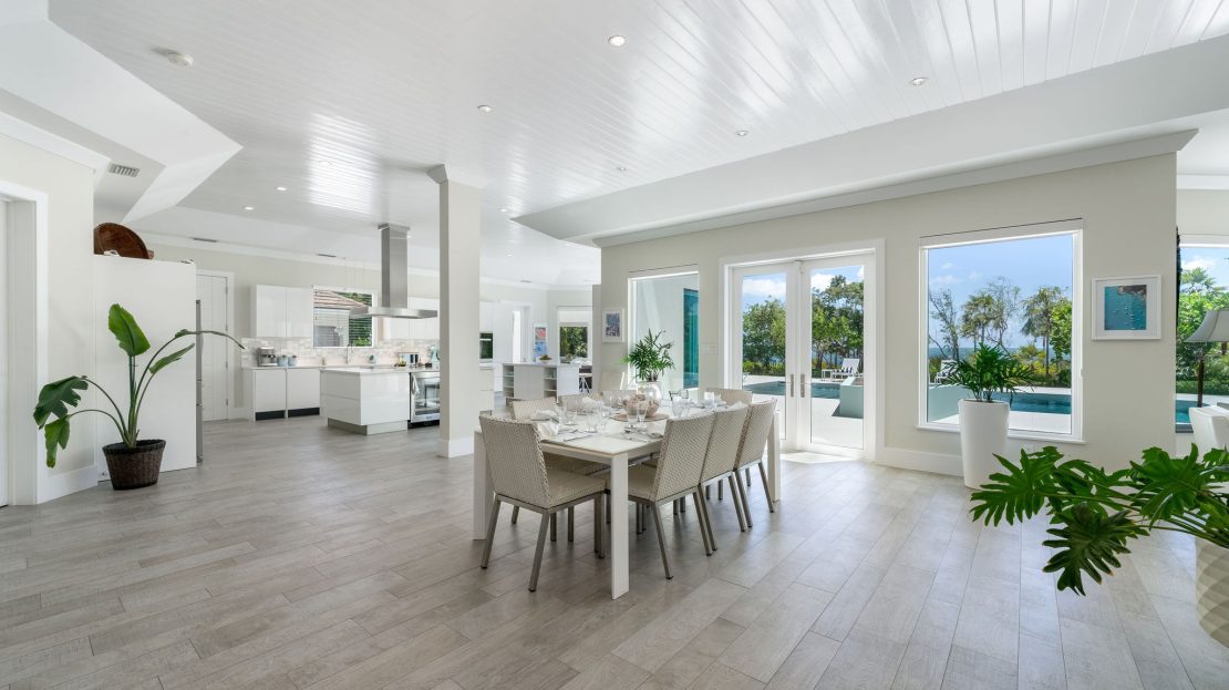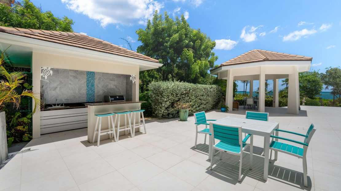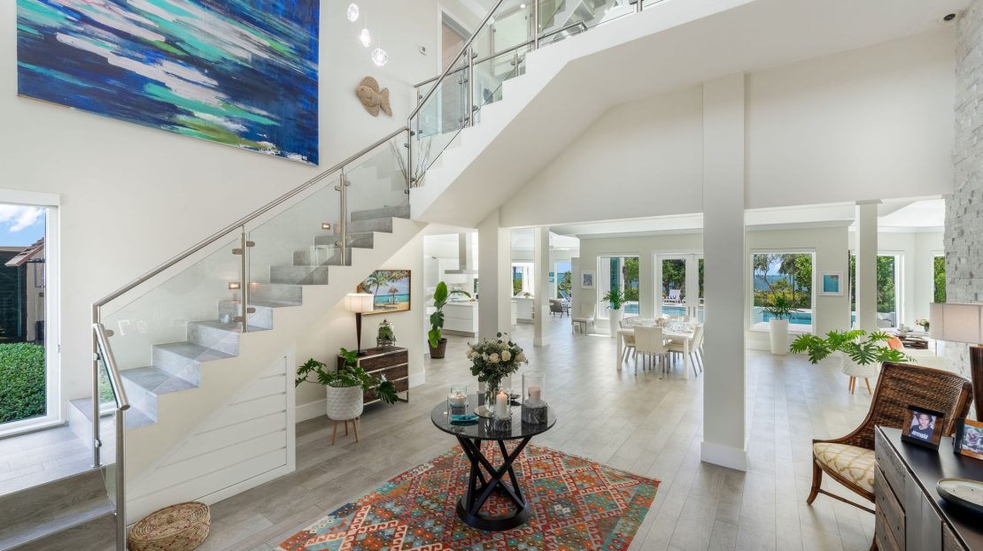 Upon entering through the private gates, you are welcomed into an impressive foyer with soaring ceilings and sweeping views of the Caribbean Sea. The open-concept design connects the living, dining, and chef’s kitchen areas—perfect for both family gatherings and grand-scale entertaining. A generously sized office and a guest suite are also located on the main floor. Oversized windows and patio doors flood the interiors with natural light and open directly to the expansive outdoor living areas, where you’ll find a resort-style pool, gazebo dining area, and manicured grounds.