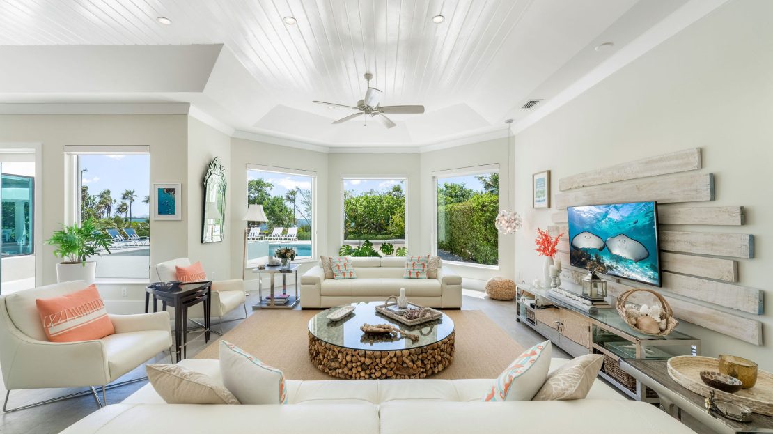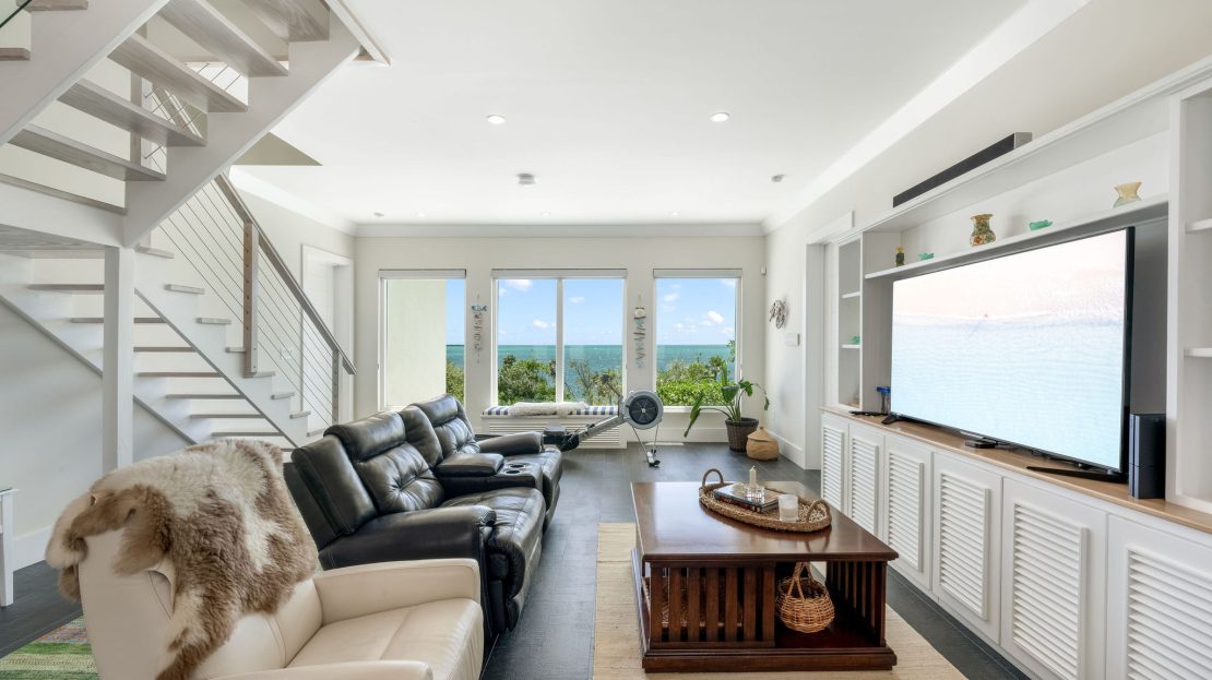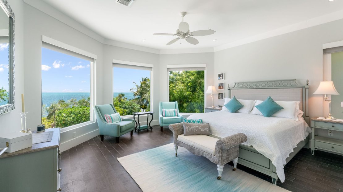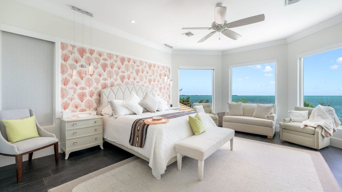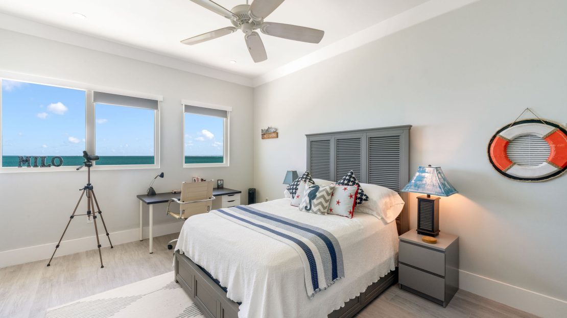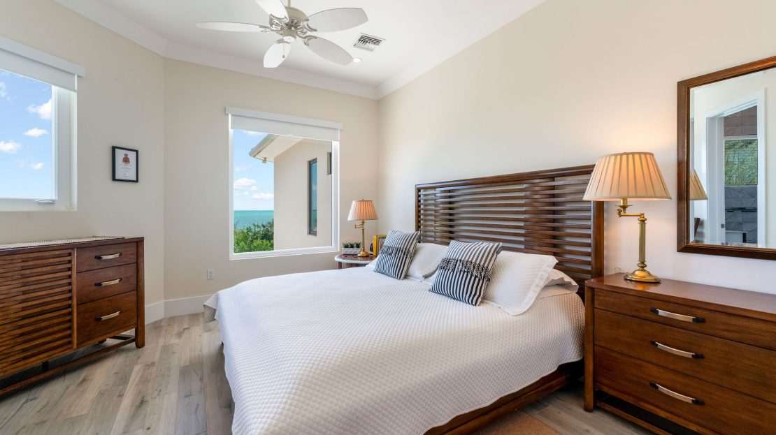 The upper level features a TV lounge and four additional bedrooms, each with ensuite bathrooms. The primary suite offers breathtaking views of the North Sound from its bay window and cozy seating area. A separate staircase leads to a third-floor bedroom or office, complete with ensuite bath and commanding sea views.
