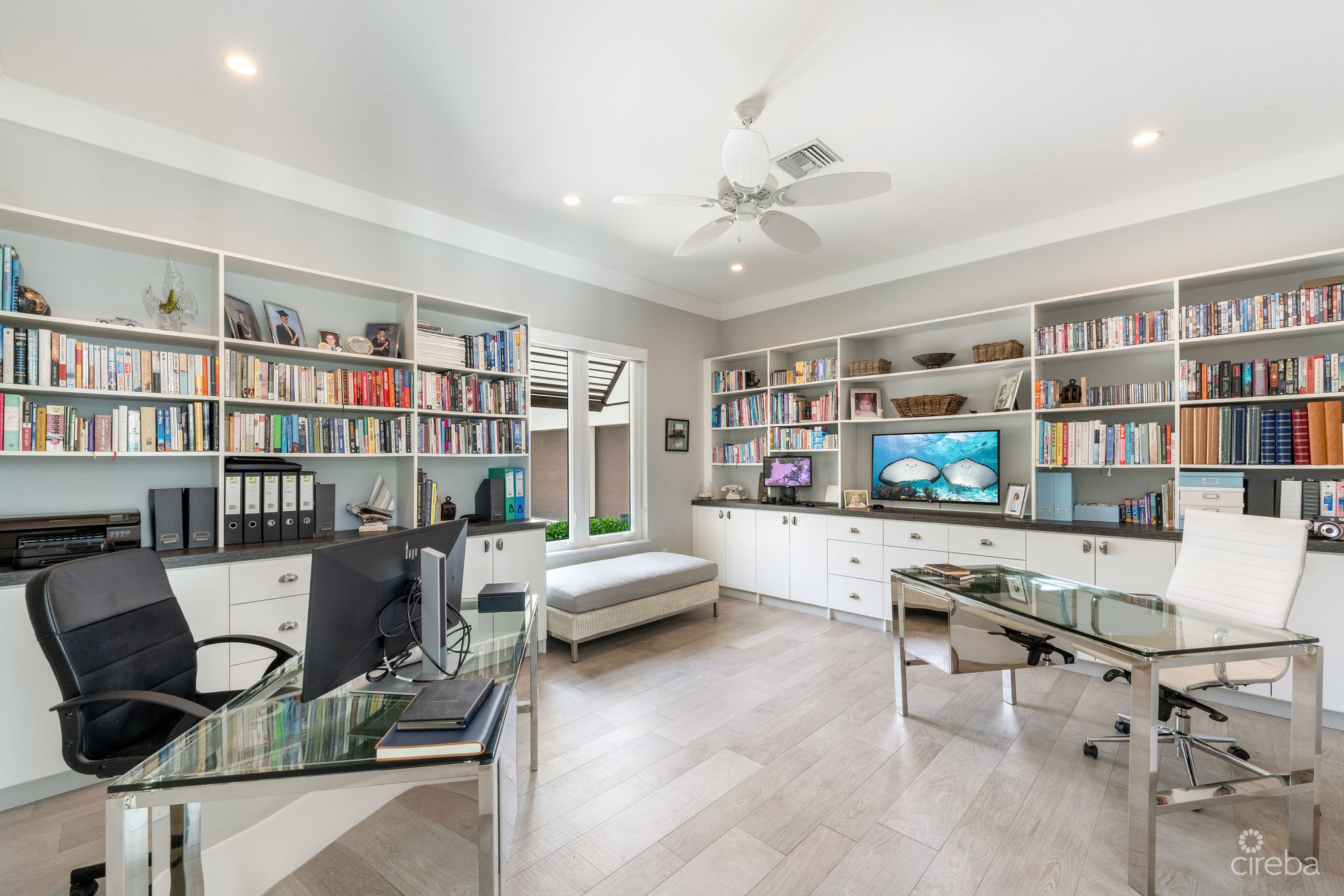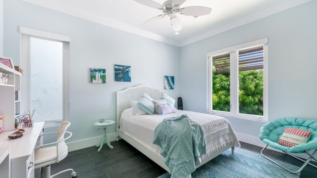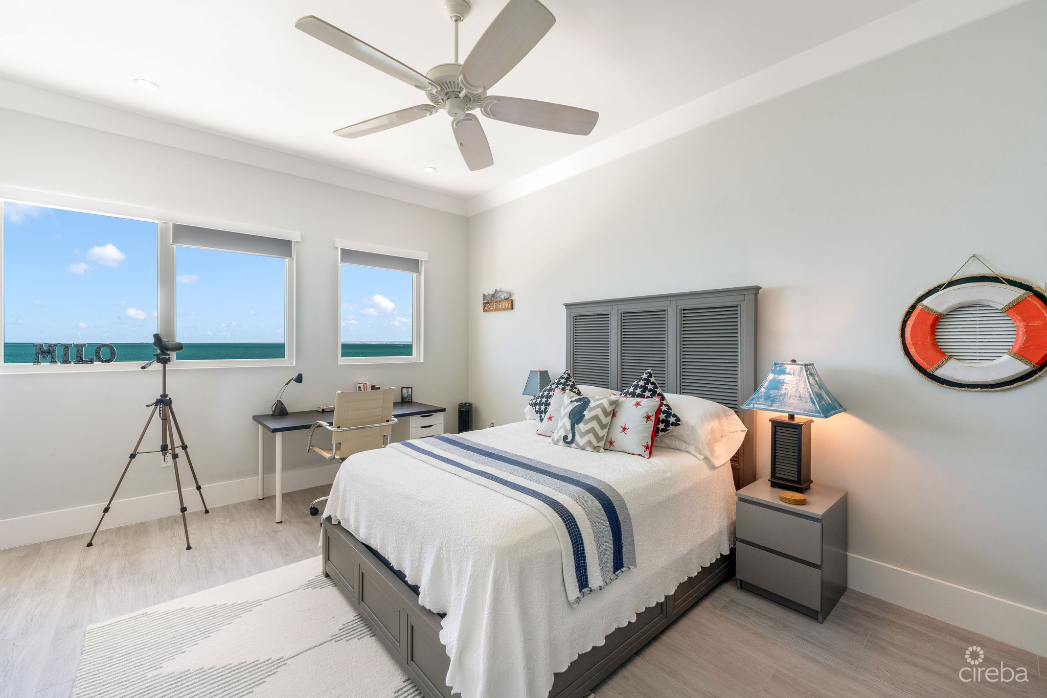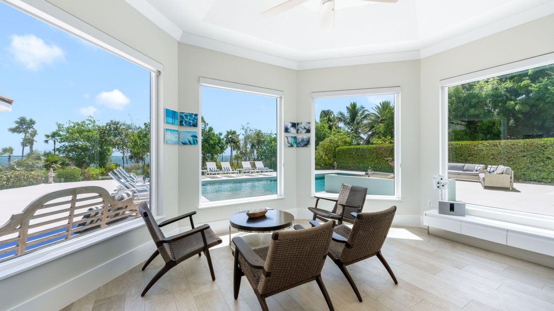 The upper level features a TV lounge and four additional bedrooms, each with ensuite bathrooms. The primary suite offers breathtaking views of the North Sound from its bay window and cozy seating area. A separate staircase leads to a third-floor bedroom or office, complete with ensuite bath and commanding sea views.