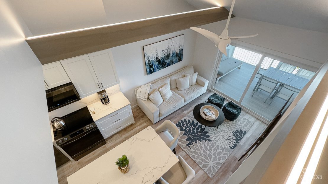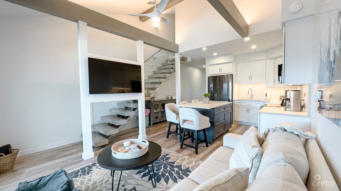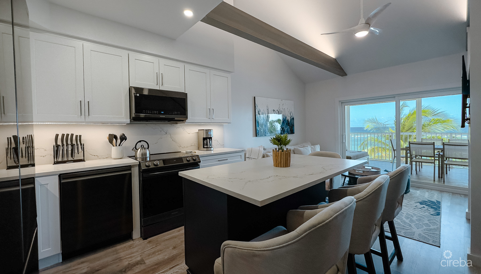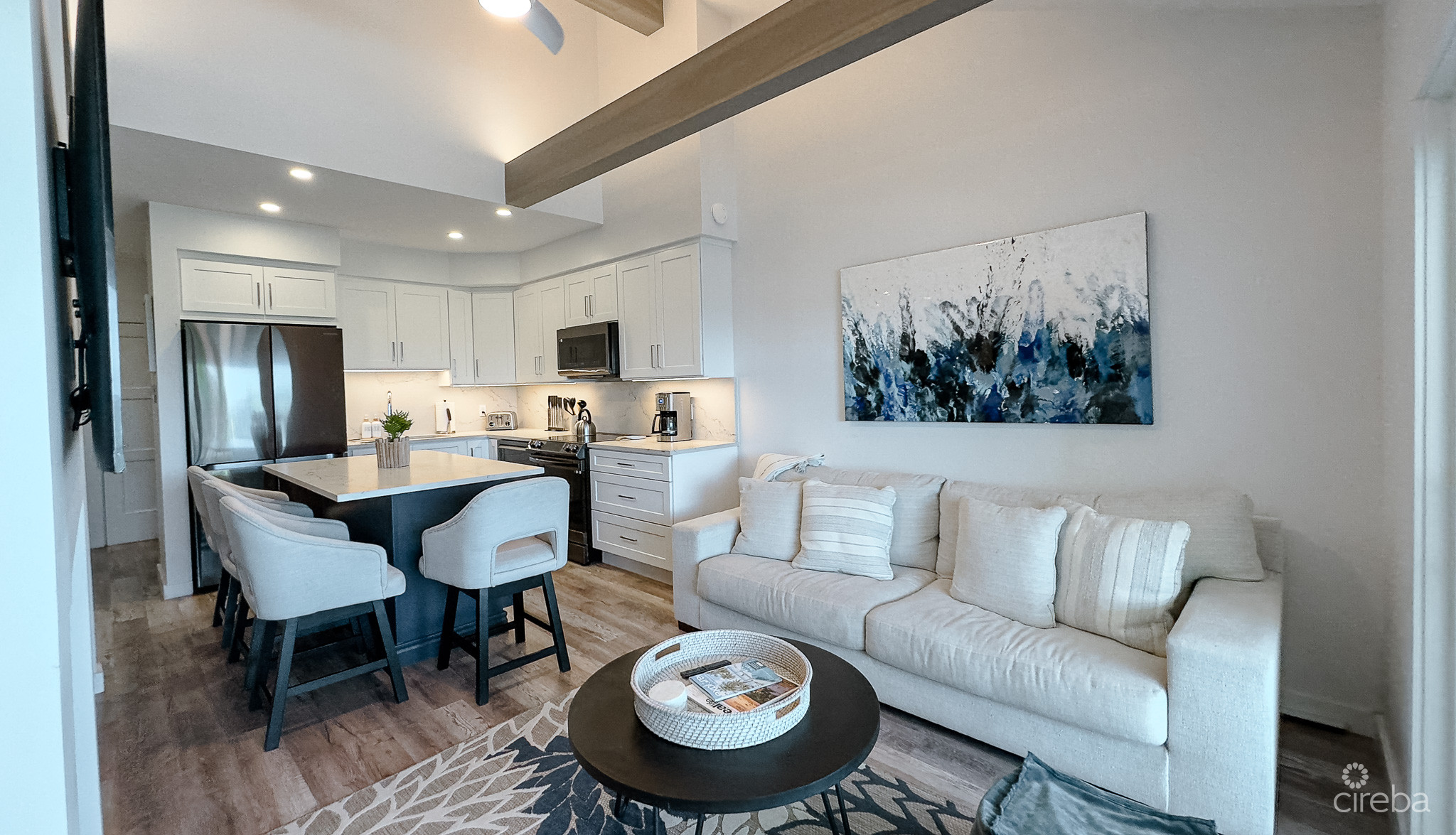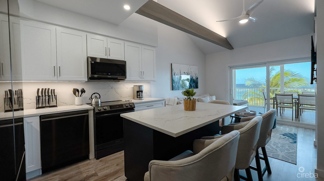 Step inside to discover a modern, thoughtfully designed interior that perfectly complements the stunning outdoor surroundings. Every inch of this top-floor unit has been meticulously updated, offering a move-in-ready experience. The open-plan living and dining area is bathed in natural light, with large windows framing the uninterrupted Caribbean Sea views. High-end finishes, stylish fixtures, and a contemporary coastal aesthetic make this condo feel like a private retreat.