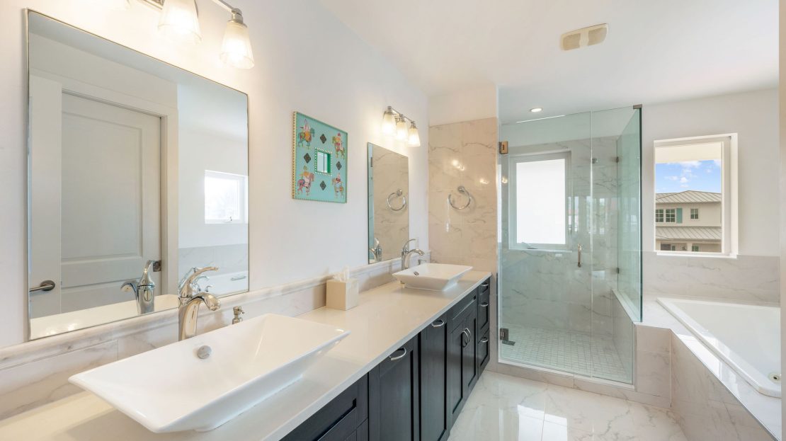 The primary suite is a sanctuary of comfort, featuring a king-size bed, a spa-like en-suite bathroom with a deep soaking tub and walk-in shower, and a spacious walk-in closet. The two additional bedrooms are equally inviting, each offering a queen-size bed, an en-suite bathroom, and large built-in closets.