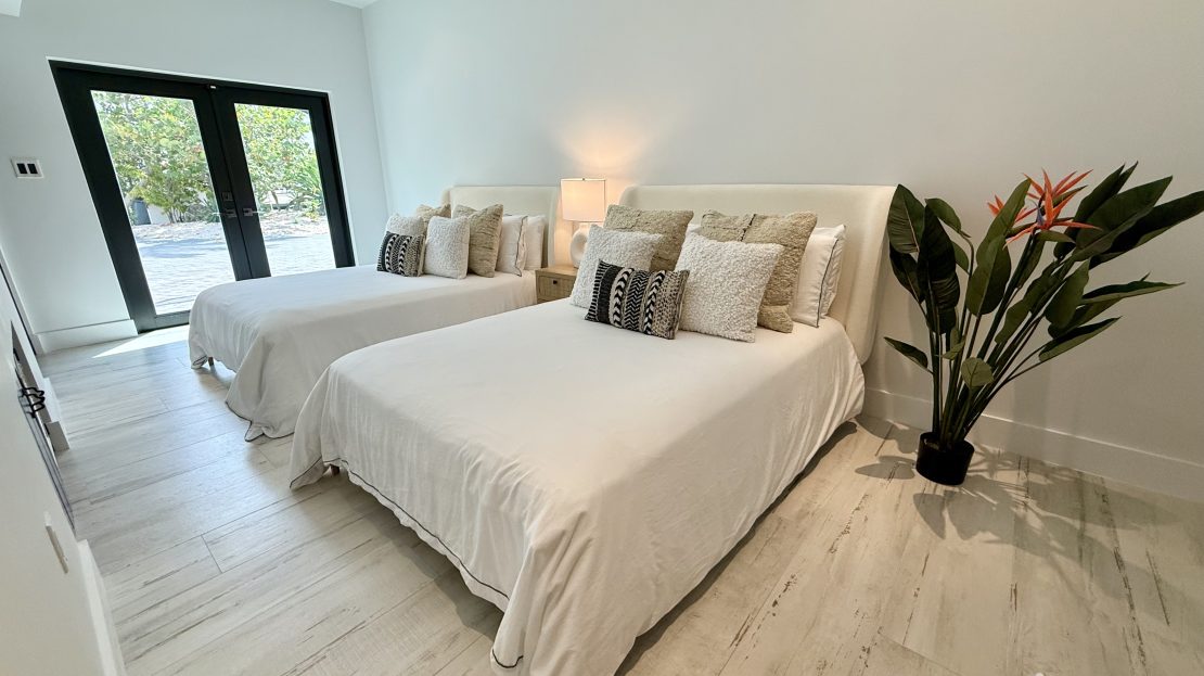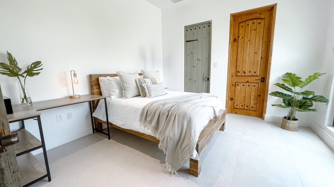 Crisp white walls, wood beams, soft neutral tones, and custom designer finishes shape a sophisticated island aesthetic.