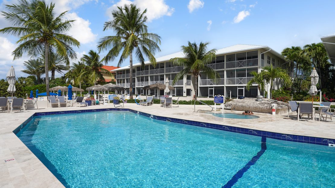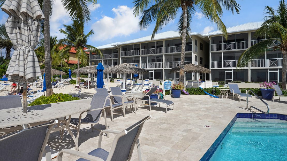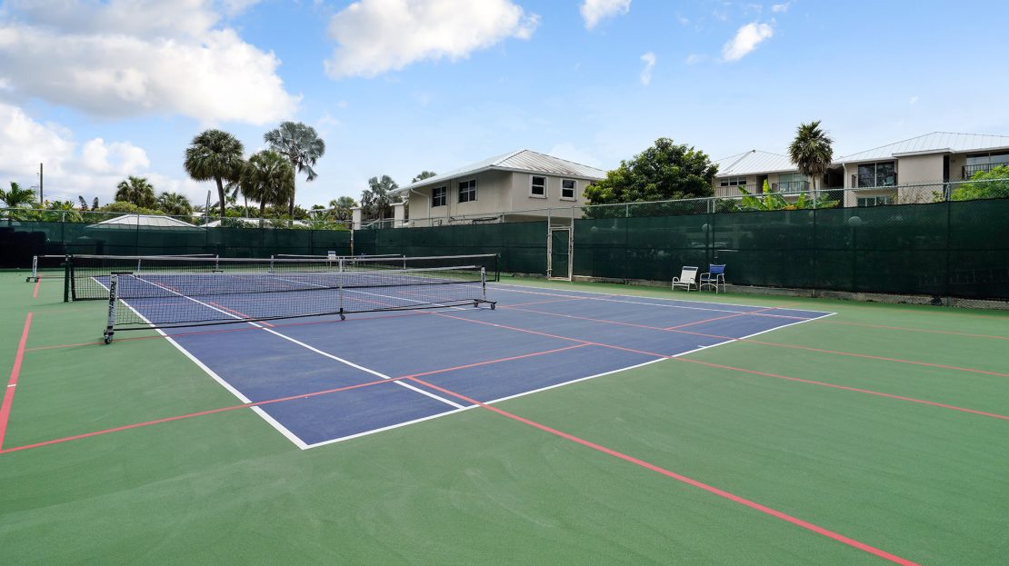Resort Amenities: Large oceanfront pool and sundeck, hot tub, tennis and pickleball courts, basketball area, and ample parking.