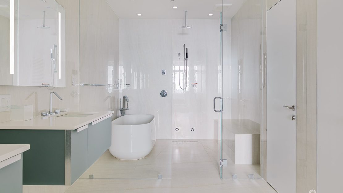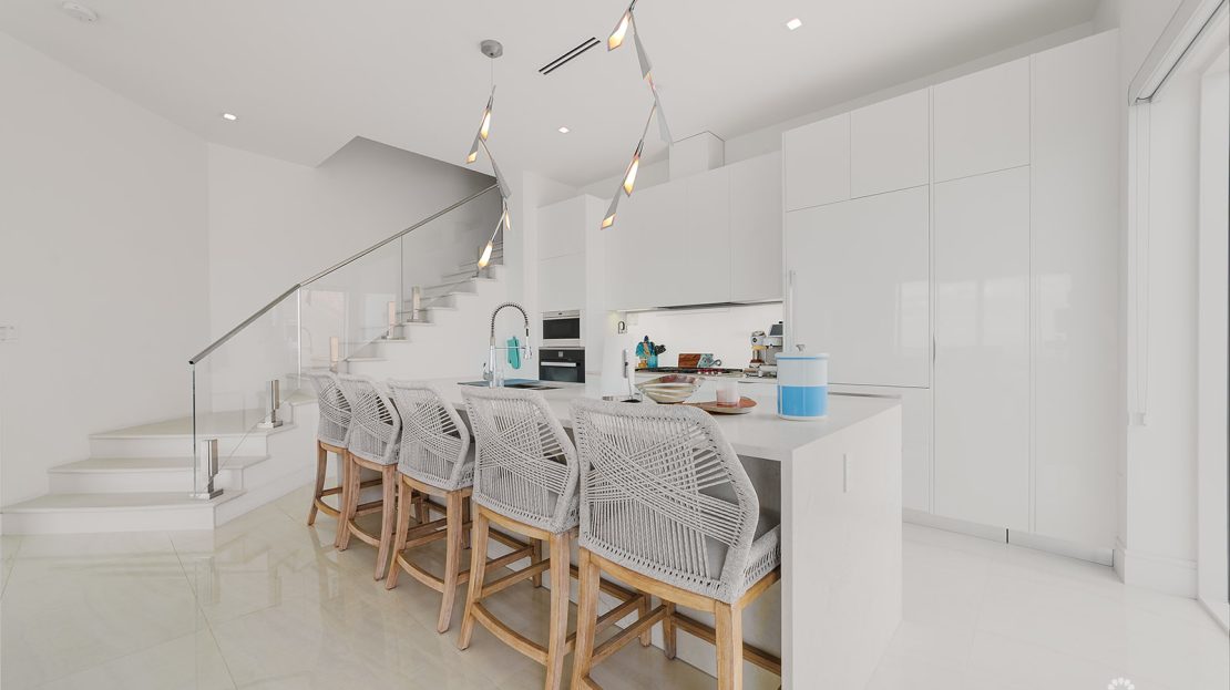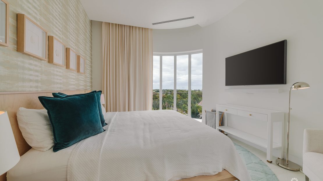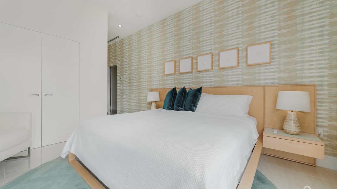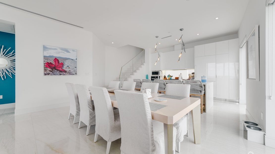 Perched atop the prestigious FIN development on South Church Street, Penthouse 29 is a striking three-level, 4,604-square-foot corner residence with incredible ocean views. Expertly furnished by Design Studio, this four-bedroom, four-and-a-half-bathroom home captures light through floor-to-ceiling windows and skylights, highlighting its marble flooring and modern finishes.