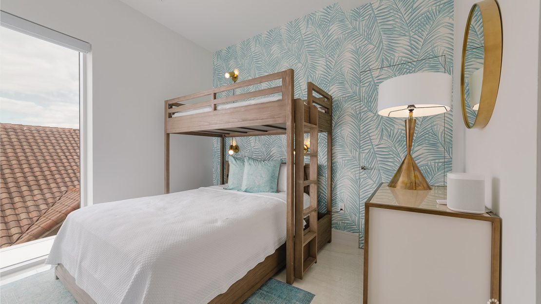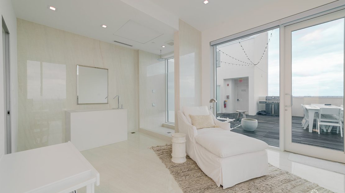 A private elevator opens directly into the second floor, where two guest bedrooms with full baths, a reading nook, and a laundry room with oversized washer and dryer create a thoughtful and functional living space. Sonos speakers are installed throughout the residence, bringing high-quality sound to every room. Unique to this penthouse is a wrap-around terrace featuring a plunge pool, fire table, outdoor dining area with grill, and sweeping ocean views.