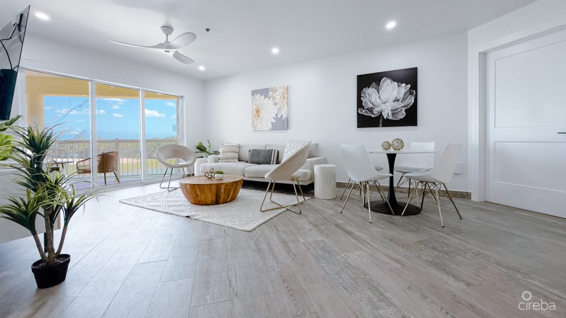 This is not just a penthouse—it’s a lifestyle statement. Step out onto two large private balconies overlooking the lush greens of the 18-hole North Sound Golf Course and the tranquil Caribbean Sea. Here, your morning coffee comes with a sunrise view, and your evenings wind down to ocean breezes and the 7-Mile Beach Skyline.