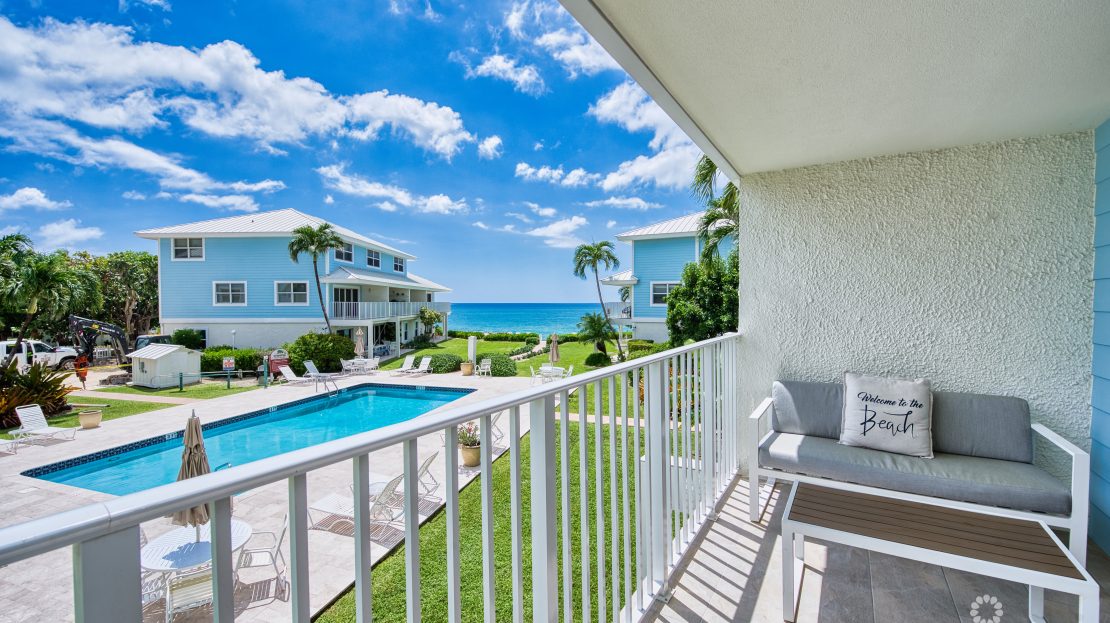 Located on the second floor, this residence features a generous living area that opens to a private balcony overlooking the ocean, pool, and landscaped gardens. Upstairs, both bedrooms enjoy elevated vantage points and gentle natural light, creating restful spaces that feel connected to the surrounding environment.