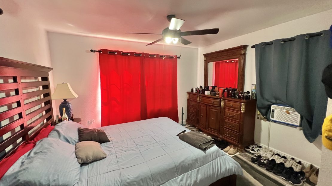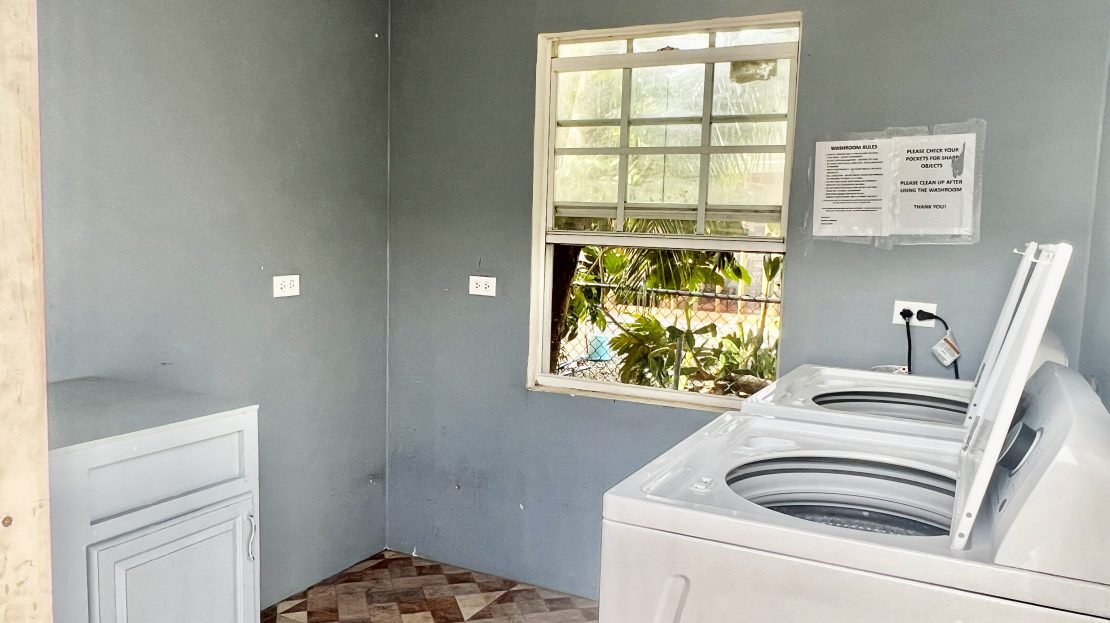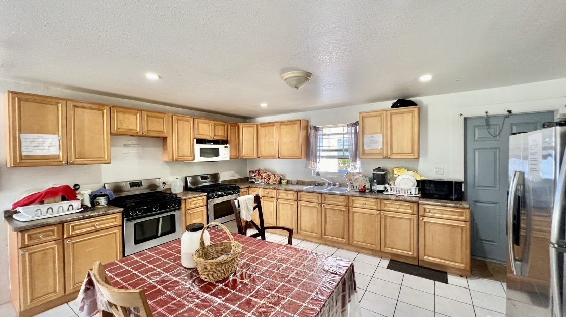The spacious main house includes a large living room and dining area, perfect for communal living. The well-equipped kitchen features double stoves, refrigerators, and abundant cabinetry, making it ideal for multiple tenants. A separate laundry room in the backyard adds convenience for residents.