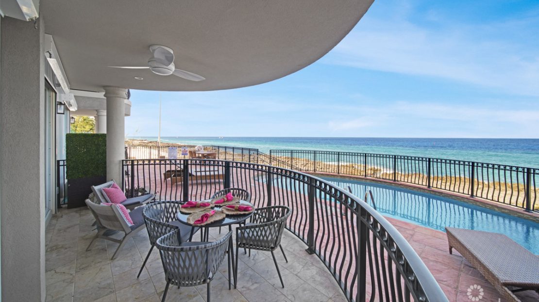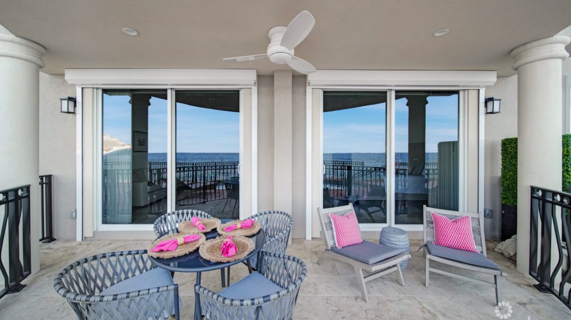 Recently renovated, this unit showcases a sophisticated Tiffany Blue-inspired interior, paired with high-end finishes and contemporary luxury. The design embraces 10-foot ceilings, travertine flooring, and 8-foot solid wood doors, creating an open and airy atmosphere that frames the stunning ocean views.