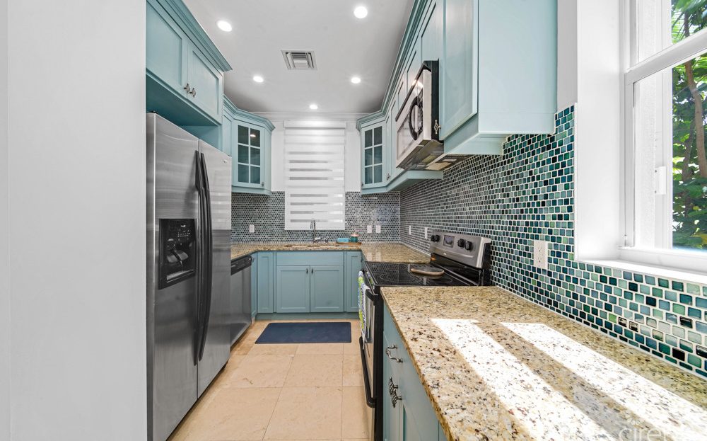 The gourmet kitchen includes an oversized granite bar-island and brand-new stainless steel appliances. Fully furnished with elegant designer pieces, original local artworks, and professionally designed interiors, it offers a turnkey living experience. Modern comforts include a new AC condenser, energy-efficient lighting, a laundry nook with high-efficiency washer/dryer, private exterior storage room and two dedicated parking spaces.