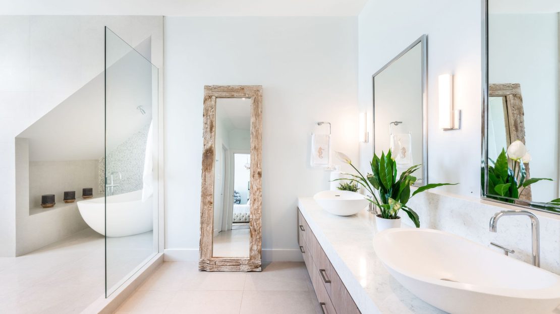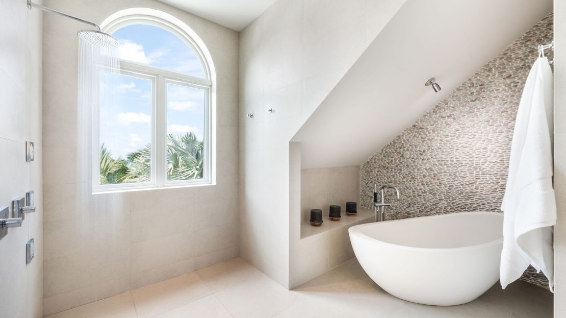 Upstairs, the second-floor features four en-suite bedrooms and a spacious den outfitted with an 85-inch Samsung TV and Sonos sound system, perfect for relaxing movie nights or gatherings. The master suite is a sanctuary unto itself, complete with a luxurious rain shower, a freestanding tub overlooking serene ocean vistas, and custom-designed finishes that enhance the atmosphere of sophistication. Warm engineered hardwood floors, curated art installations and a HVAC scenting system add a touch of timeless elegance throughout.