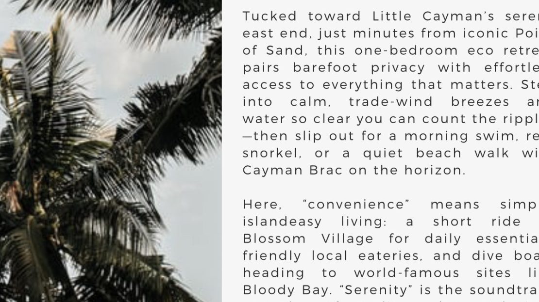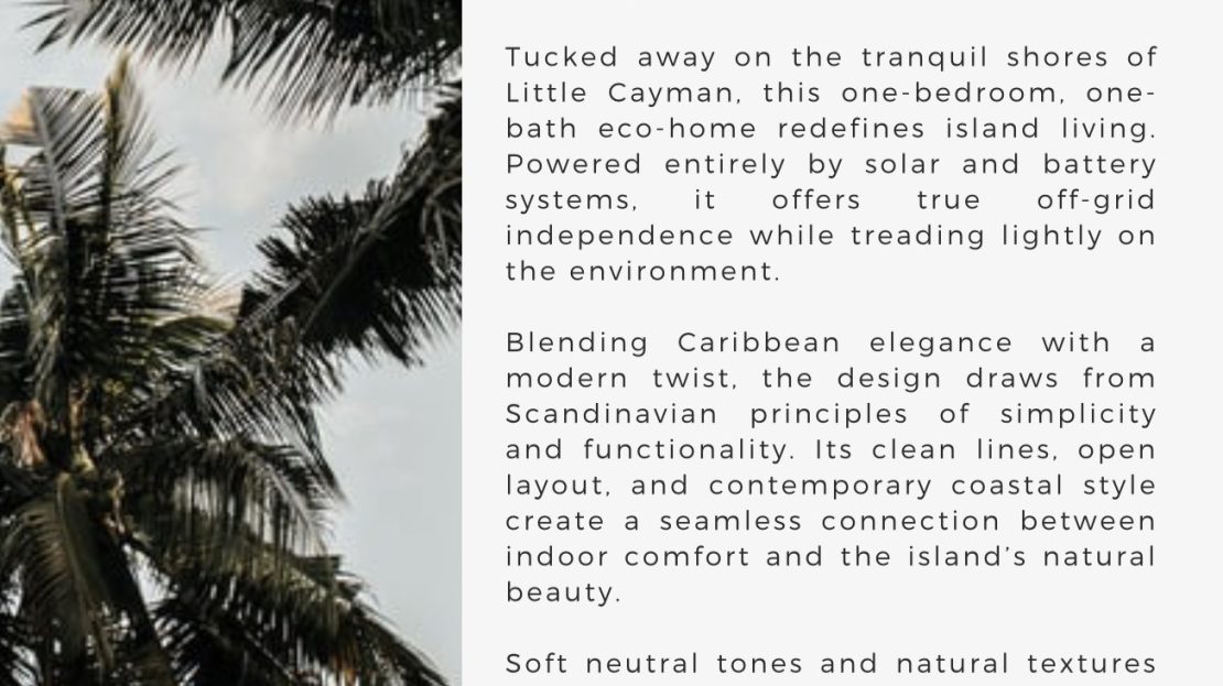 Own your own little piece of paradise in Little Cayman! Little Breeze packs a big punch sitting on .85 acre of beautiful ocean view property (photo taken off Lands and Survey). Pre construction allows for optimal pricing for this one bath, one bed island hide away. Green powered with solar and battery, your home will be extremely energy efficient. Contact us about Little Breeze today!