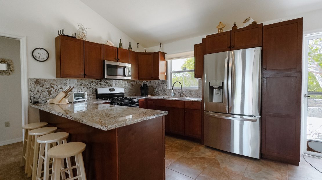 Inside, a fully equipped kitchen opens into the dining and utility area, with practical comforts including central A/C, washer/dryer, refrigerator, and microwave. The home is furnished, so you can settle in right away or transition it into a vacation rental with ease.