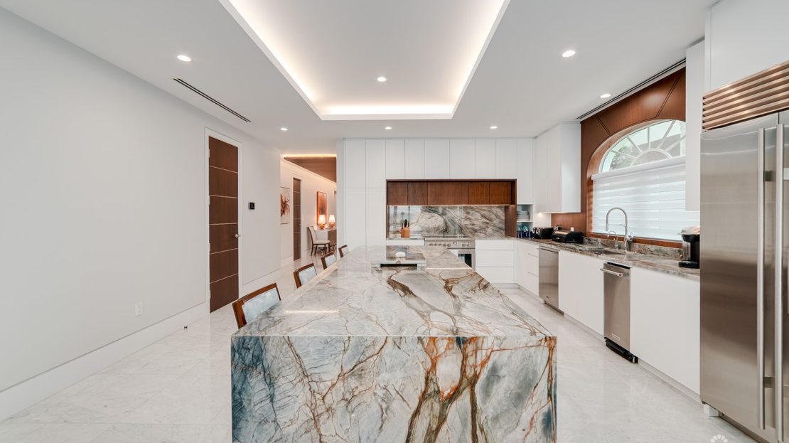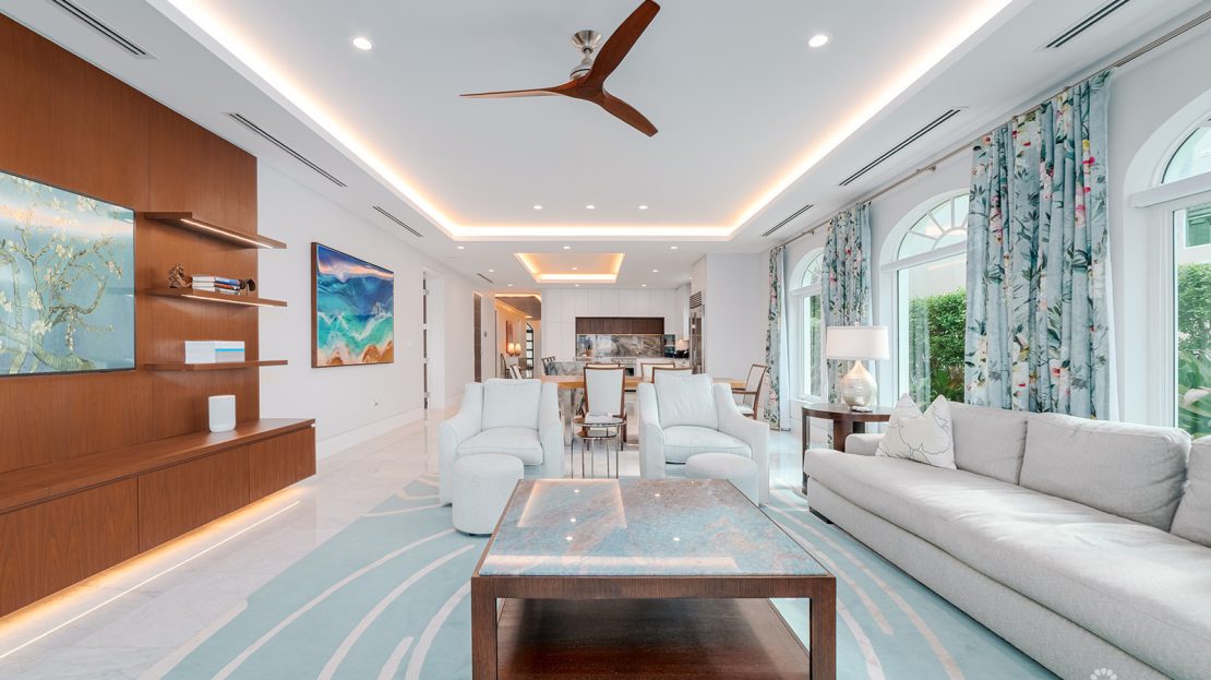 The open plan living and dining areas are filled with natural light and lead to a beachfront terrace. The kitchen features custom cabinetry and high-quality appliances, while a flexible den can serve as a fourth bedroom or guest suite. All mechanical, electrical, and audiovisual systems have been updated for convenience and modern living.