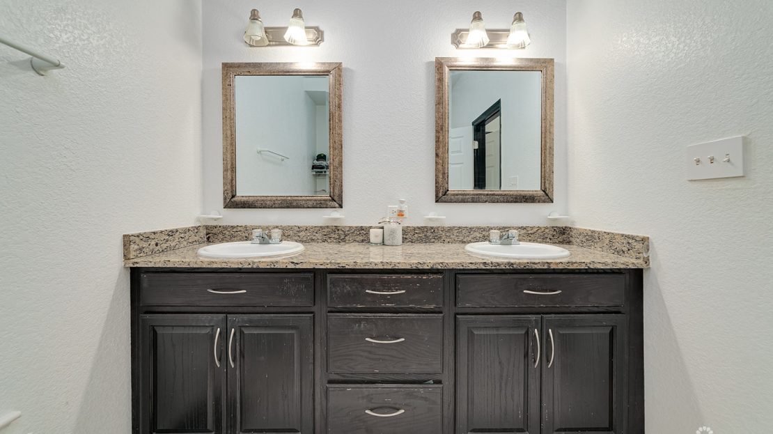 A beautifully designed en-suite bathroom featuring dual vanities, bath rub, and a linen closet.