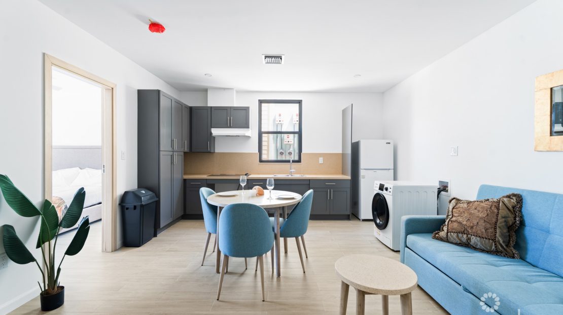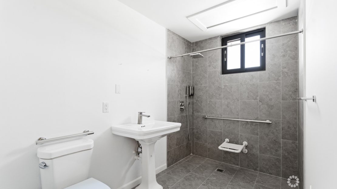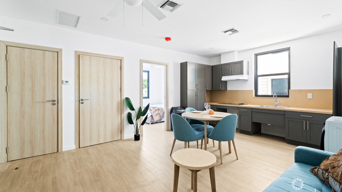 Inside each apartment, quality and functionality shine. The furniture package, included with each unit, features a sofa that converts into a bed with waterproof fabric, solid wood cabinets, and a safe for personal valuables. Quartz countertops shine through the kitchen . Bathrooms include grab bars, a shower chair, and are styled as wet rooms for easy accessibility. Each unit also includes a combined washer-dryer.