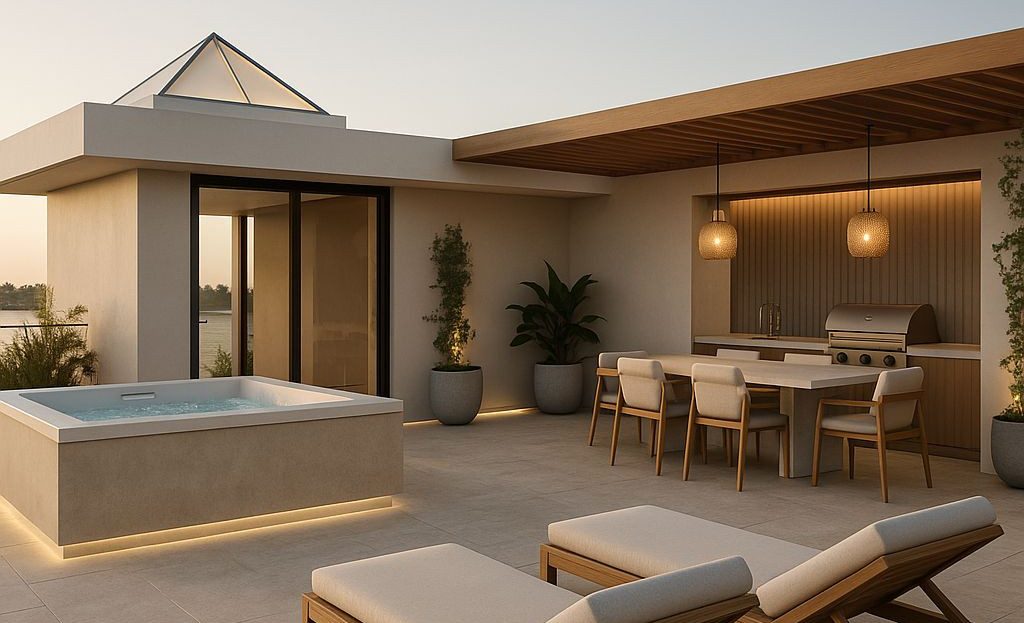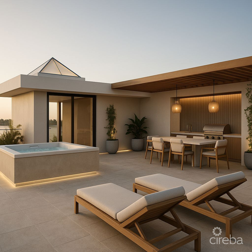 ° Third-floor rooftop terrace with sunken jacuzzi and natural travertine or porcelain decking, offering 360° water views