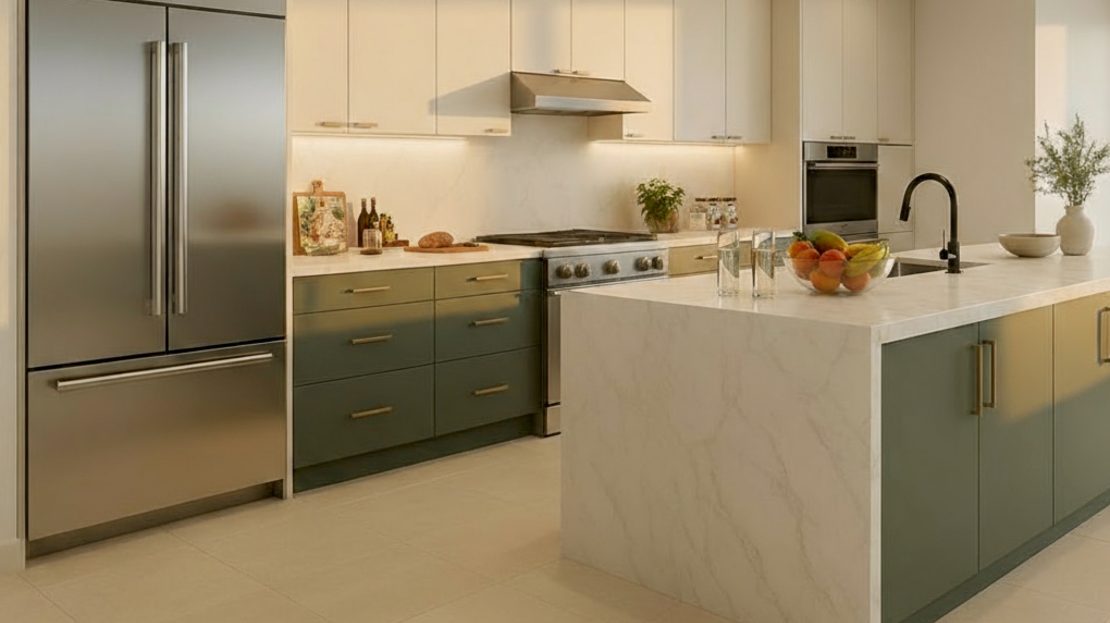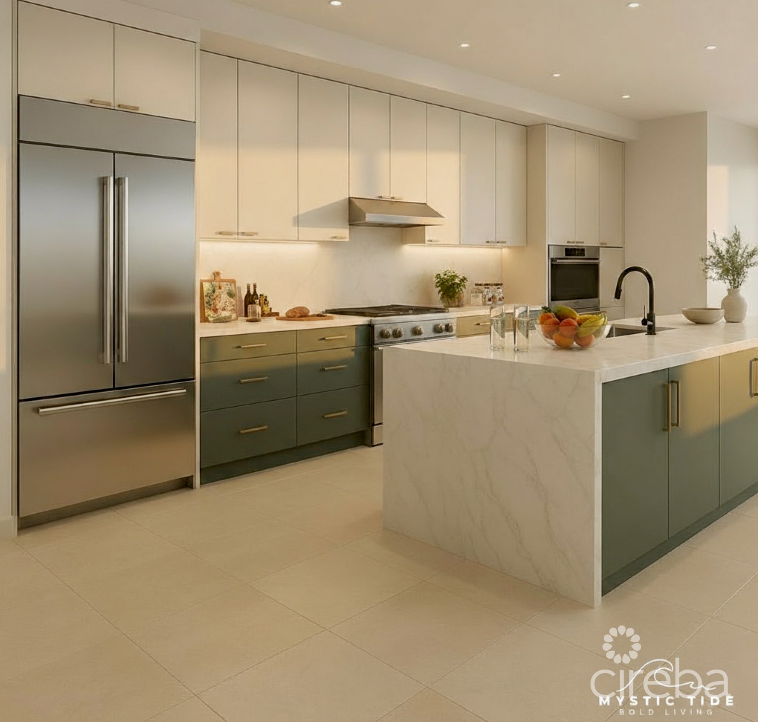° Frameless doors, flush wall finishes, and recessed baseboards with optional LED accents for seamless minimalism