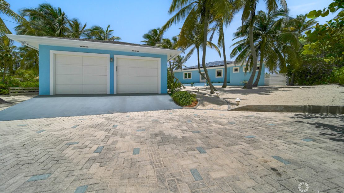 Expansive private lot featuring powdery white sand beach, lush tropical landscaping, and detached two-car garage ensuring both privacy and convenience.