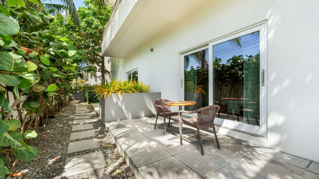 Perched at the water’s edge, this residence boasts the largest private patio in the development, complete with a private gate granting direct access to the pool deck, lush gardens, and the sea beyond.