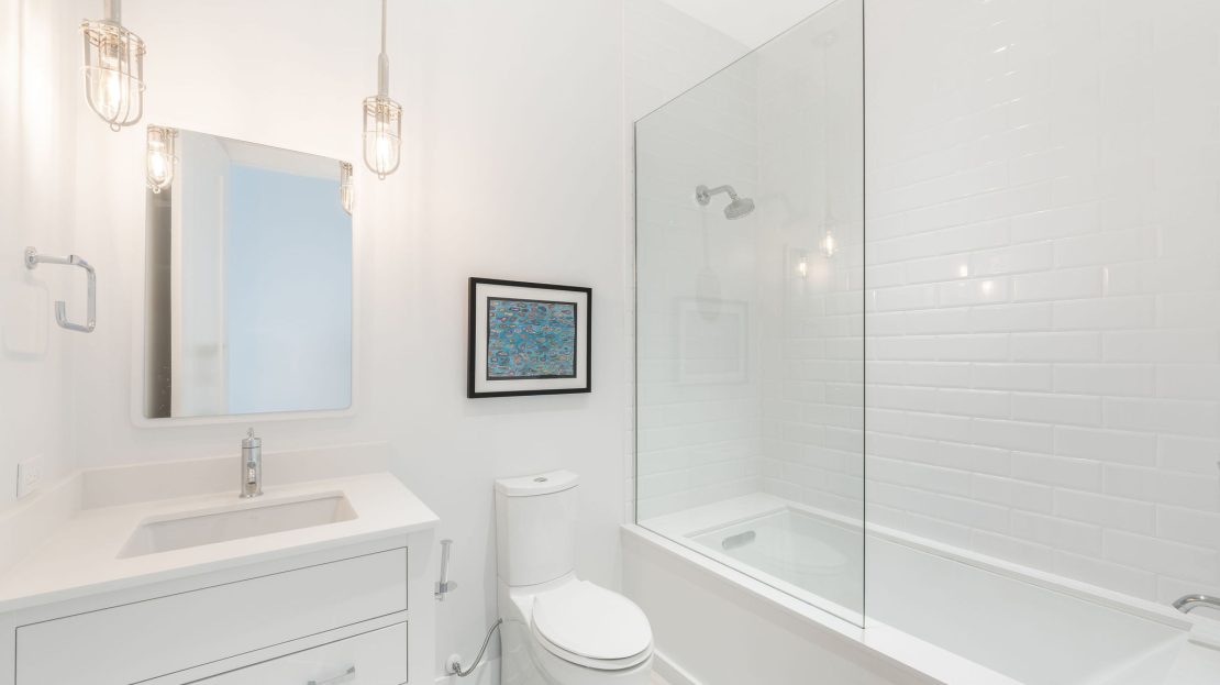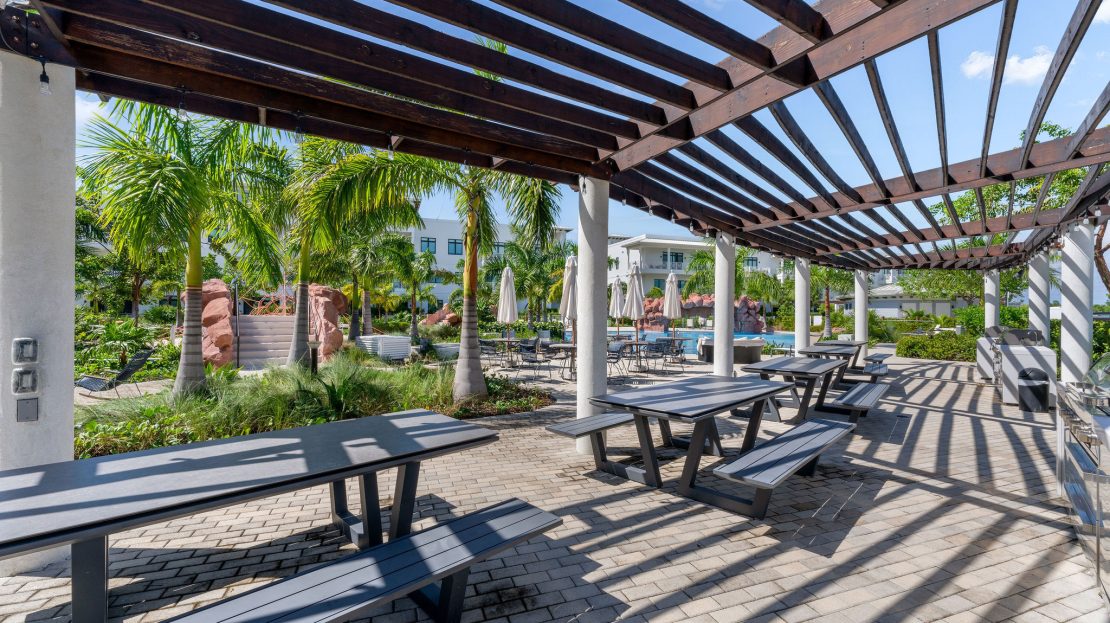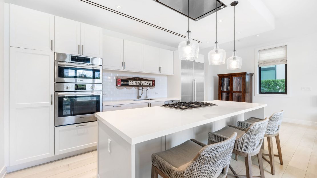 The layout maximizes space and functionality with high ceilings and large patio doors leading to a private terrace and garden. The kitchen, perfect for entertaining, includes an oversized island, breakfast bar seating, Bosch appliances, quartz countertops, and custom cabinetry. Step outside to your private pool and garden area where you can spend the perfect weekend entertaining friends & family.