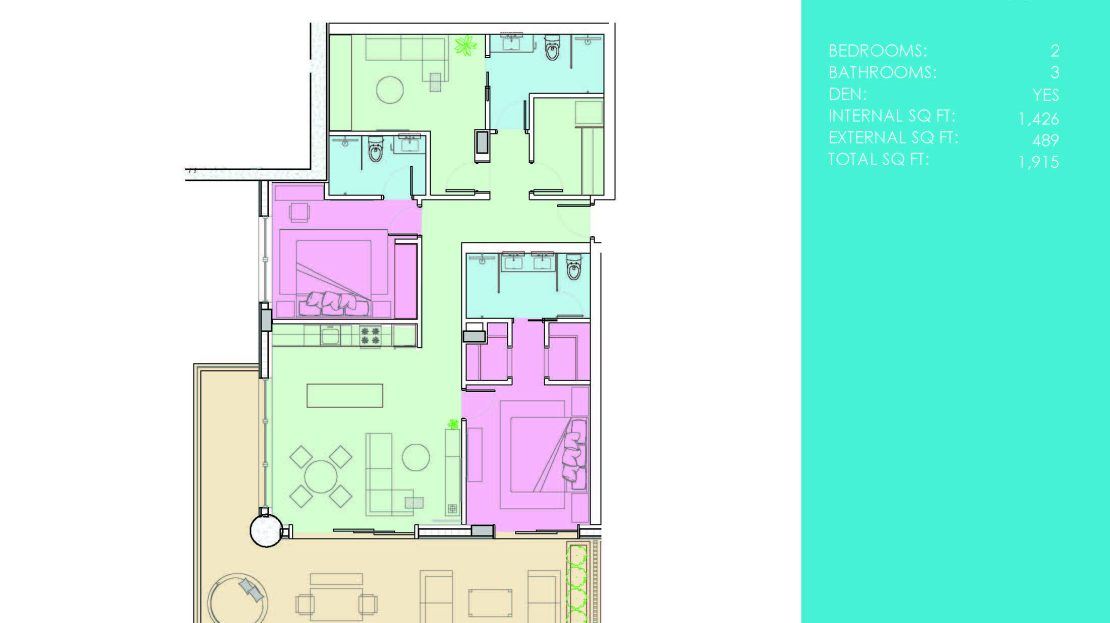 This two bedroom plus oversized den suite is one of our most versatile residences. Three ensuite bathrooms, a large utility room and a spacious wrap-around terrace make it perfect for family living, or hosting guests. The unit has a full kitchen, with center aisle and a large living/dining area, creating great indoor/outside living opportunities. Enjoy truly “elevated modern island living” at ONE|GT and invest now before prices elevate too!