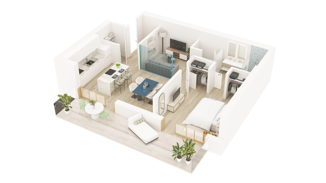 This one bedroom plus den residence features ONE | GT’s innovative articulating wall design to create a flexible living space allowing the creation of a private den. The unit offers a full kitchen with centre aisle/breakfast bar and direct access to the large private terrace from the spacious living area and the master suite with amazing views and great inside/outside space.