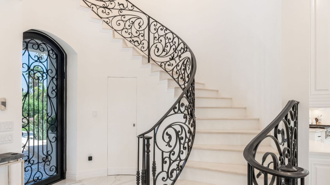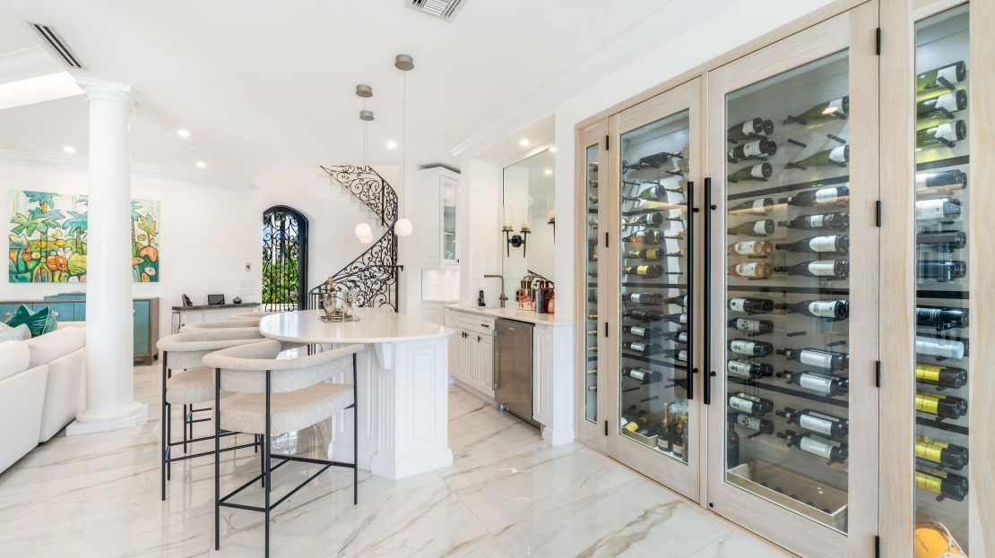 Inside, sophistication unfolds as natural light floods every room, illuminating grand open spaces and flawless detailing. The custom sculptural staircase, a bespoke creation by Karoly of Artisian Metal Works, anchors the heart of the home, blending function with artistry as it rises gracefully through the living space. The grand living room, bright and expansive, provides a fabulous gathering space for family and guests, while a beautifully appointed full bar and floor-to-ceiling glass-encased, climate-controlled wine closet, set just off this main area, make entertaining effortless and refined.