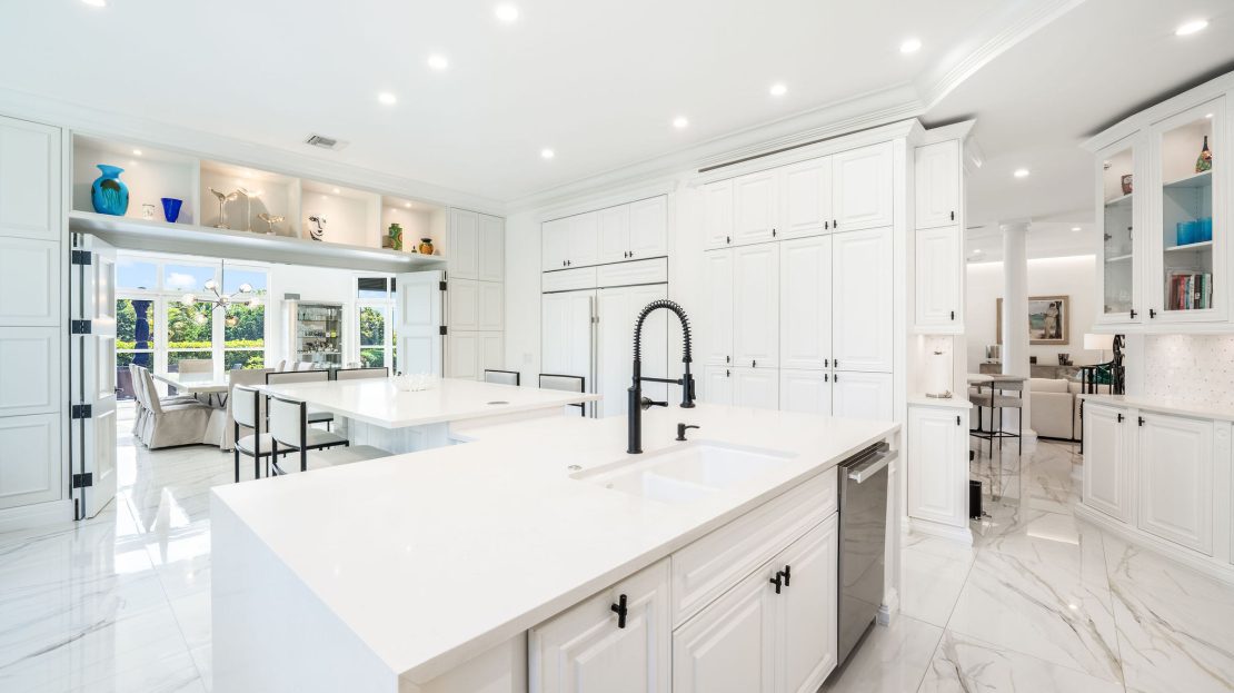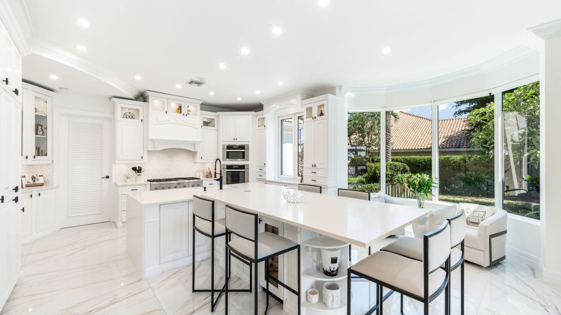 The formal dining room is surrounded by windows, creating a sophisticated, light-filled setting for memorable dinners. The chef’s kitchen, designed for both function and connection, features a built-in family dining table and an expansive butler’s pantry.