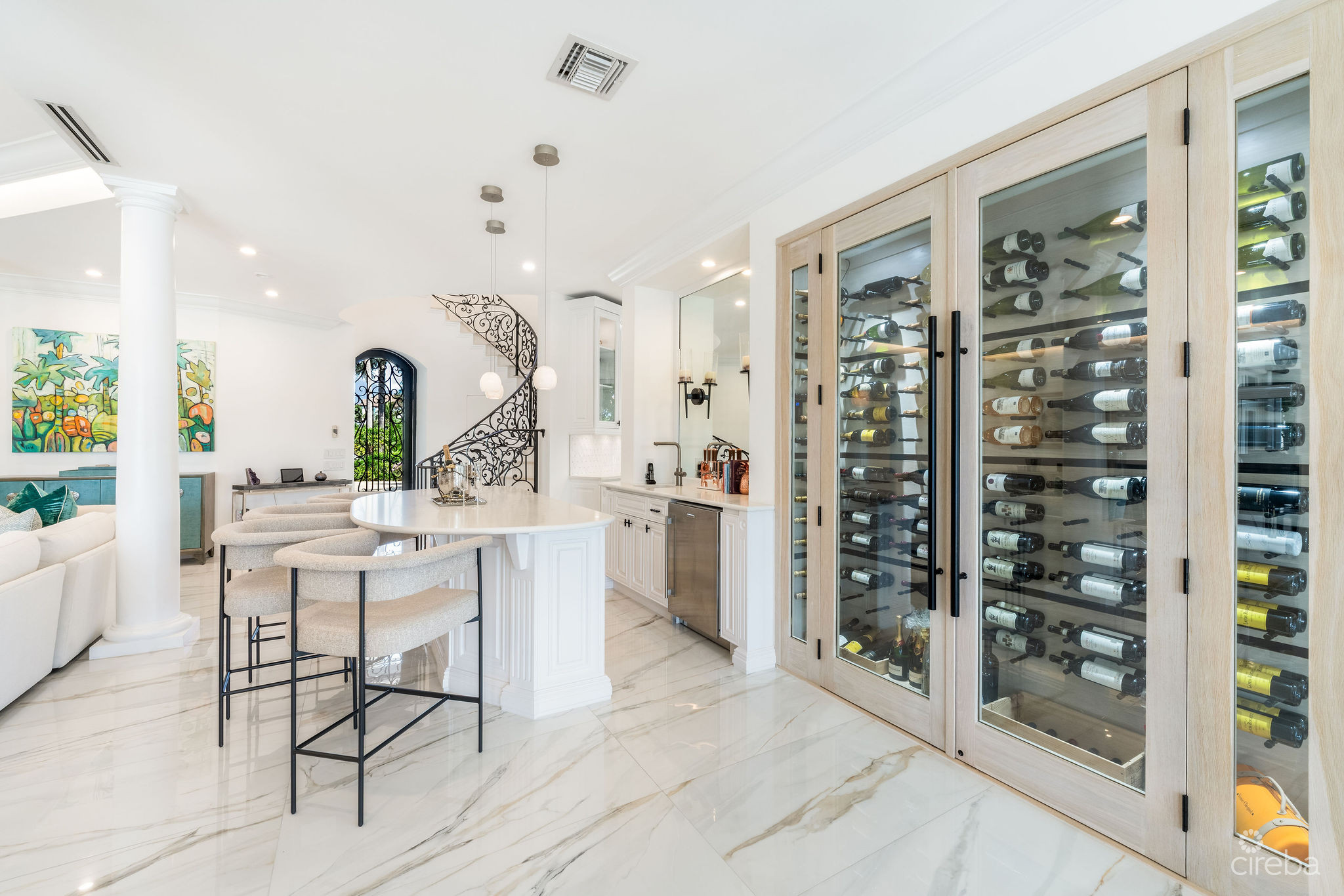 Inside, sophistication unfolds as natural light floods every room, illuminating grand open spaces and flawless detailing. The custom sculptural staircase anchors the heart of the home, blending function with artistry as it rises gracefully through the living space. The grand living room, bright and expansive, provides a fabulous gathering space for family and guests, while a beautifully appointed full bar and floor-to-ceiling glass-encased, climate-controlled wine closet, set just off this main area, make entertaining effortless and refined.