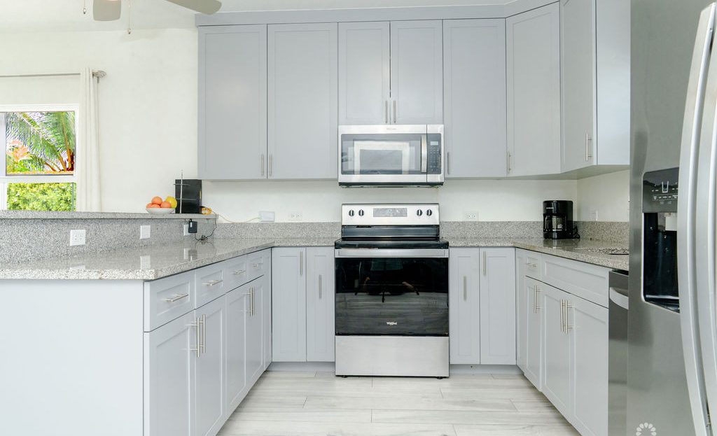 Modern Kitchen: Featuring stylish light grey shaker-style cabinetry, granite countertops, and stainless-steel appliances, this kitchen is perfect for family meals and entertaining.