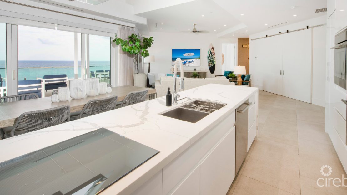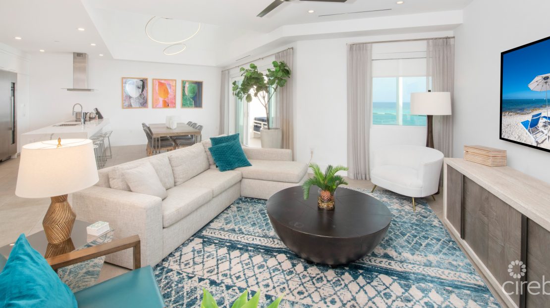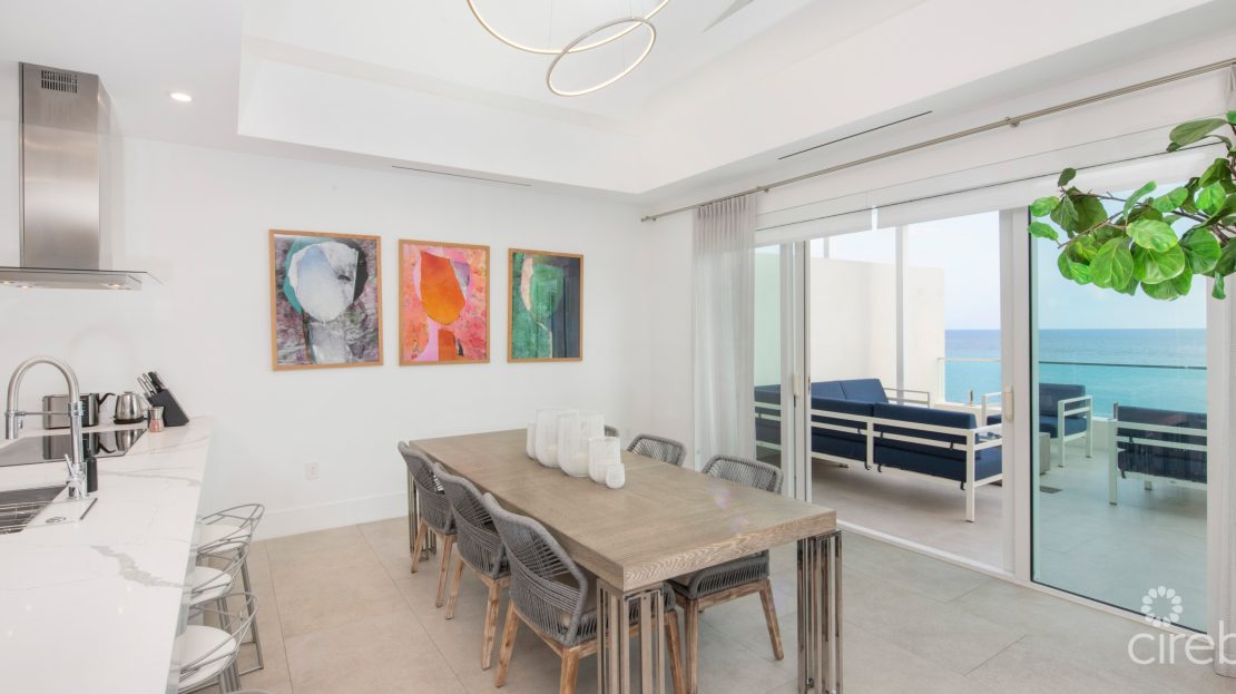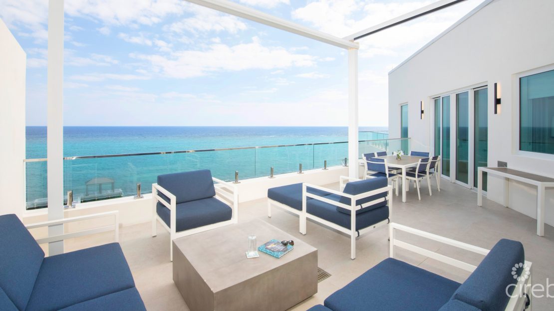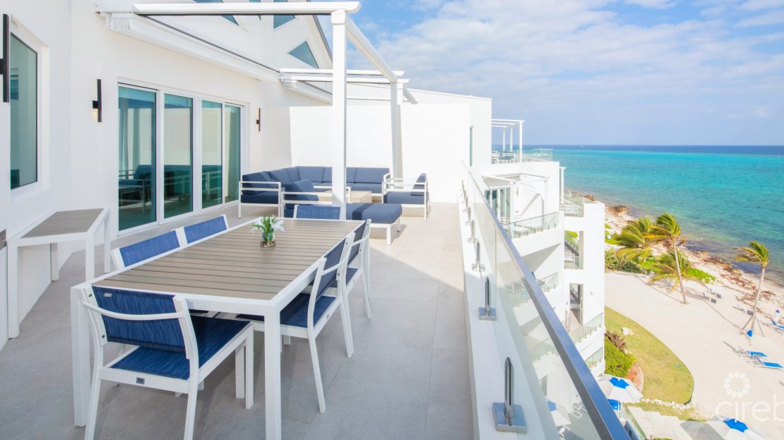 Penthouse #504 commands a prime position at Rum Point Resort – an upper-level, fully furnished three-bedroom residence with a rare wrap of views that span the Caribbean Sea, North Sound, and the waterways of Rum Point. Its expansive oceanfront terrace sets the tone: uninterrupted sunset views, broad sky, and the gentle sweep of a quiet coastline.