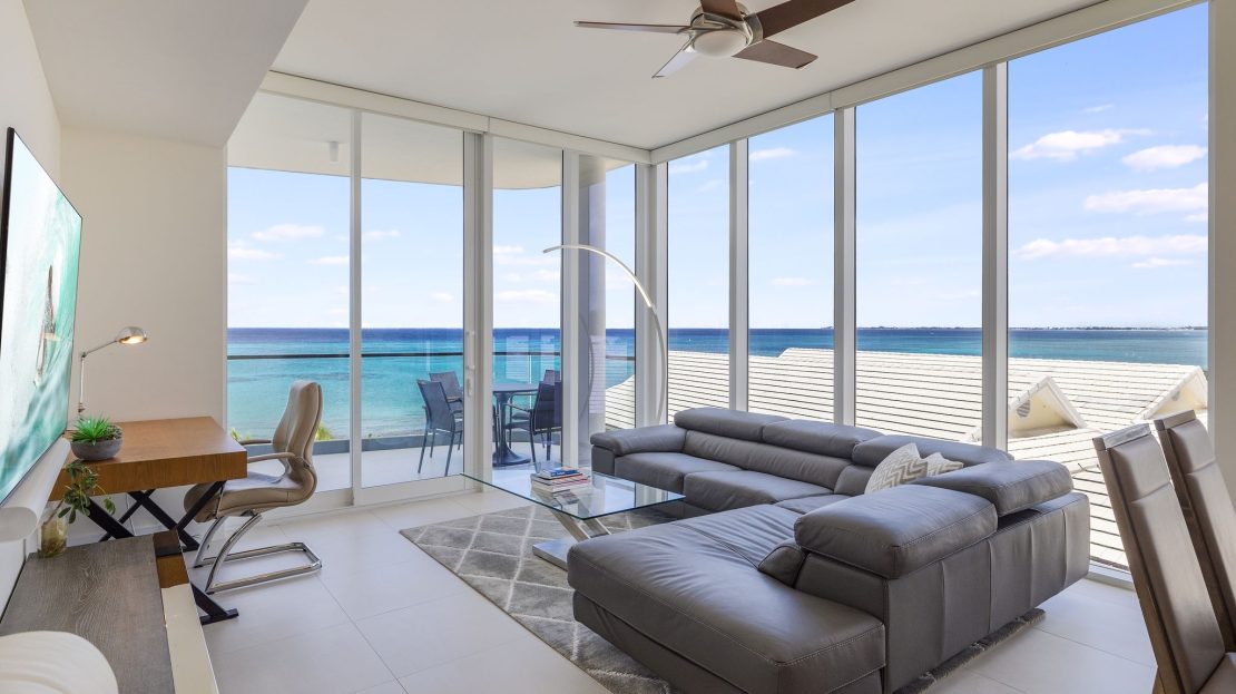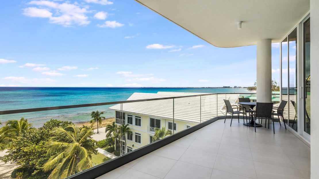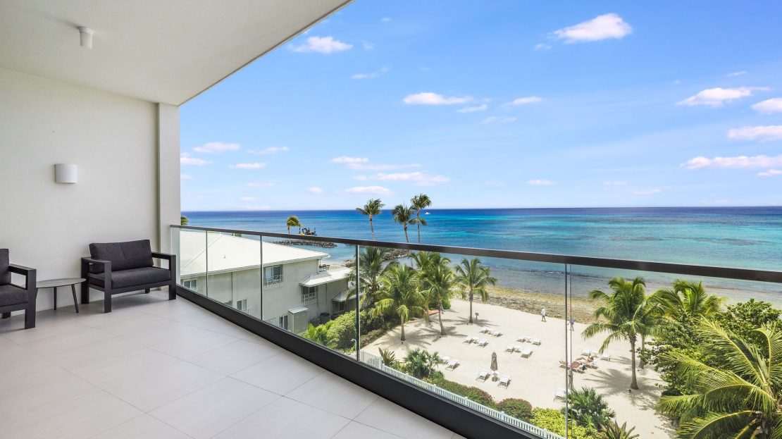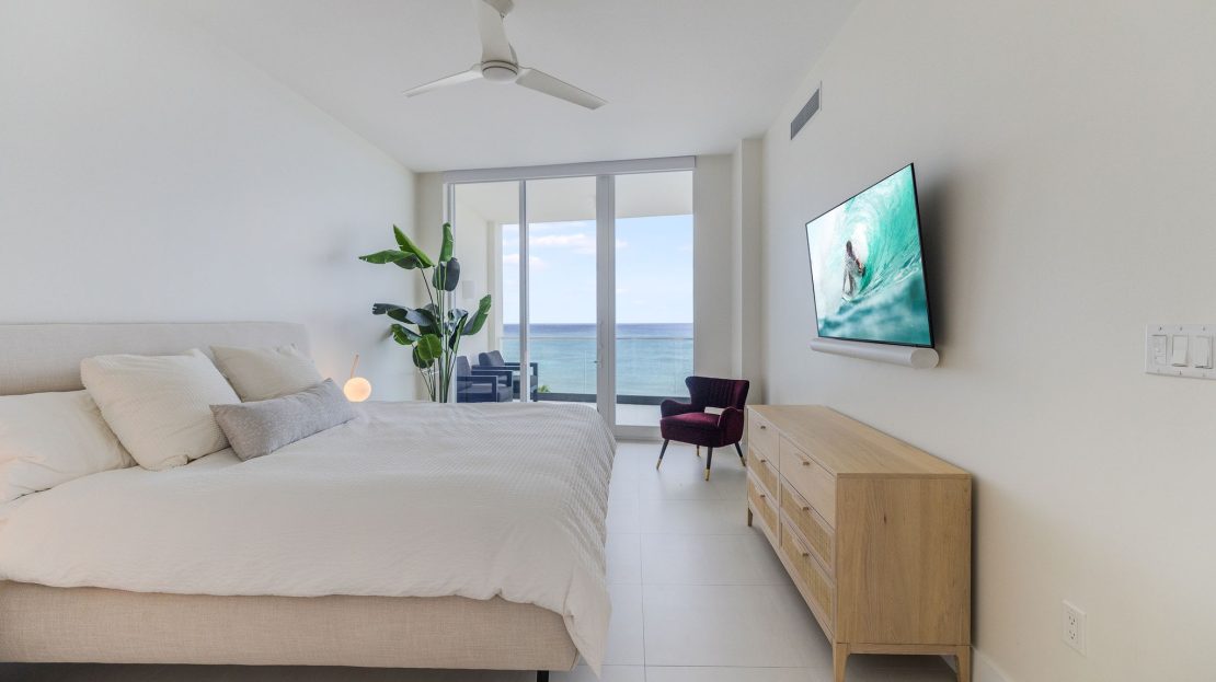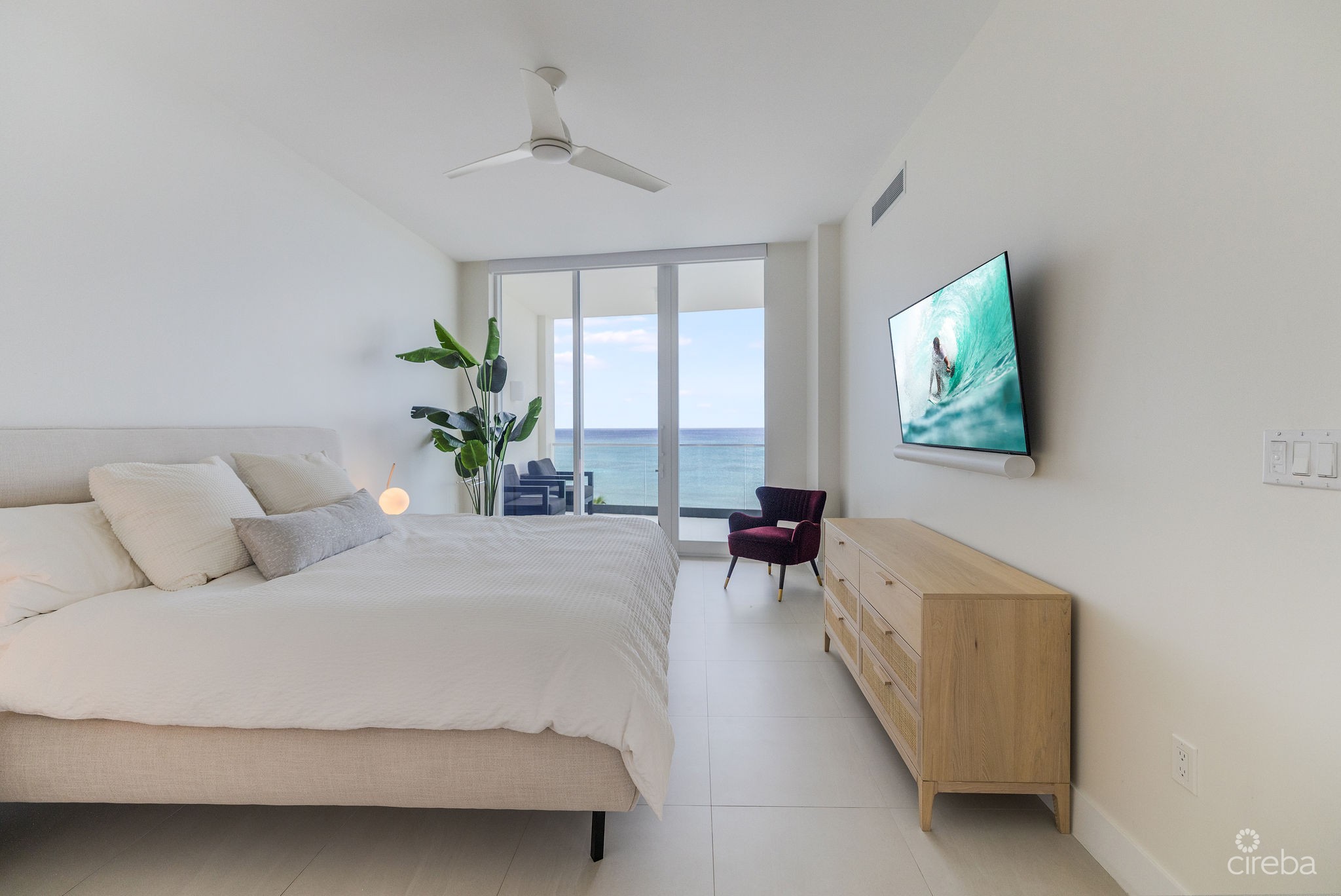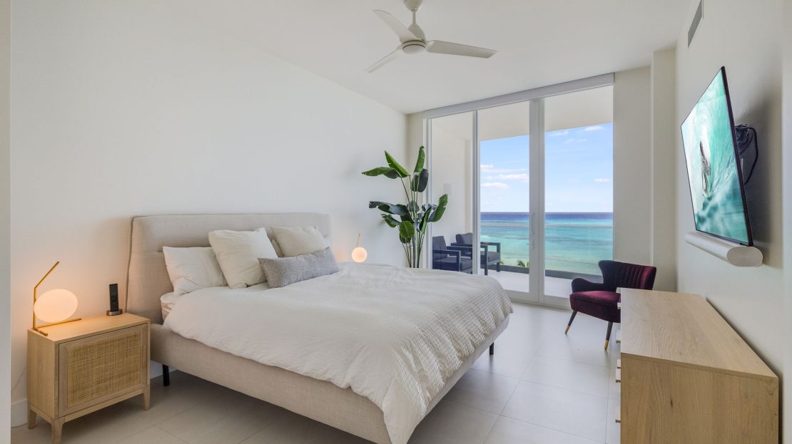 A gorgeous wide balcony on the beachfront is ideal for sunsets, lounging, dining, and entertaining. If you truly want the very best beachfront lifestyle, this residence offers unprecedented bespoke living on Seven Mile Beach. It is completely turnkey – fully furnished with brand new furnishings, bedding, linens, comprehensive kitchen package of everything that you would ever need including countertop appliances, and an enhanced audio visual package with Samsung Art Frame TVs in the living room and each bedroom,