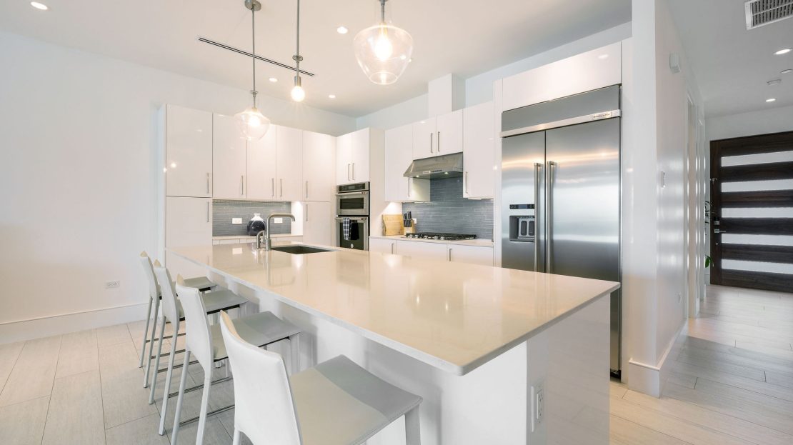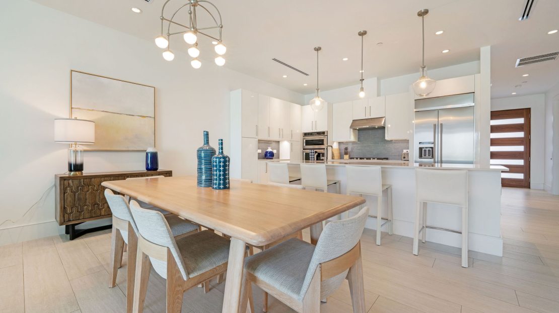 The kitchen is both elegant and functional, equipped with fully integrated stainless steel KitchenAid appliances, a large island, quartz countertops, a wine fridge, and ample storage – perfect for both casual meals and entertaining guests.