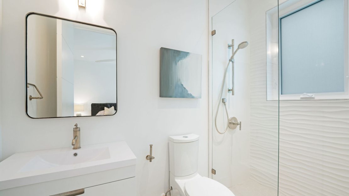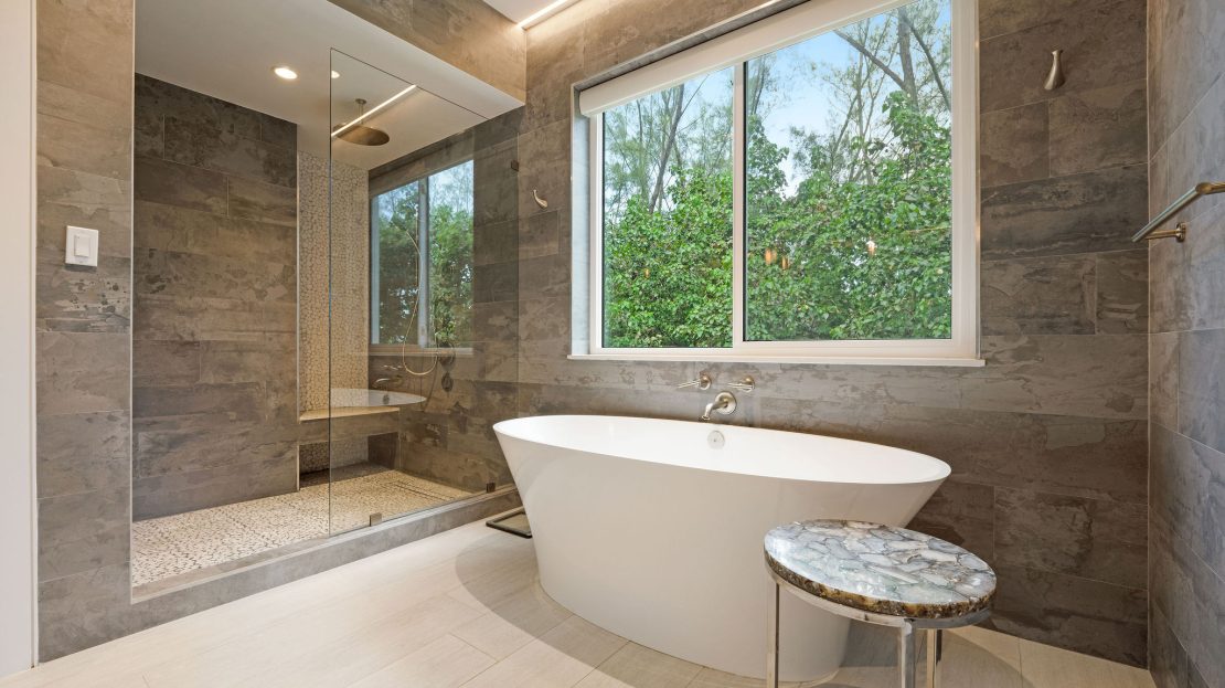The ocean-facing master suite offers a serene retreat, complete with a luxurious spa-style bathroom featuring a freestanding tub and a walk-in rain shower.