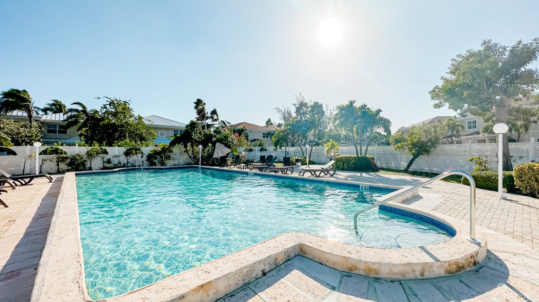 The beautifully maintained grounds are framed by lush tropical landscaping, offering a private sanctuary in the middle of the action.