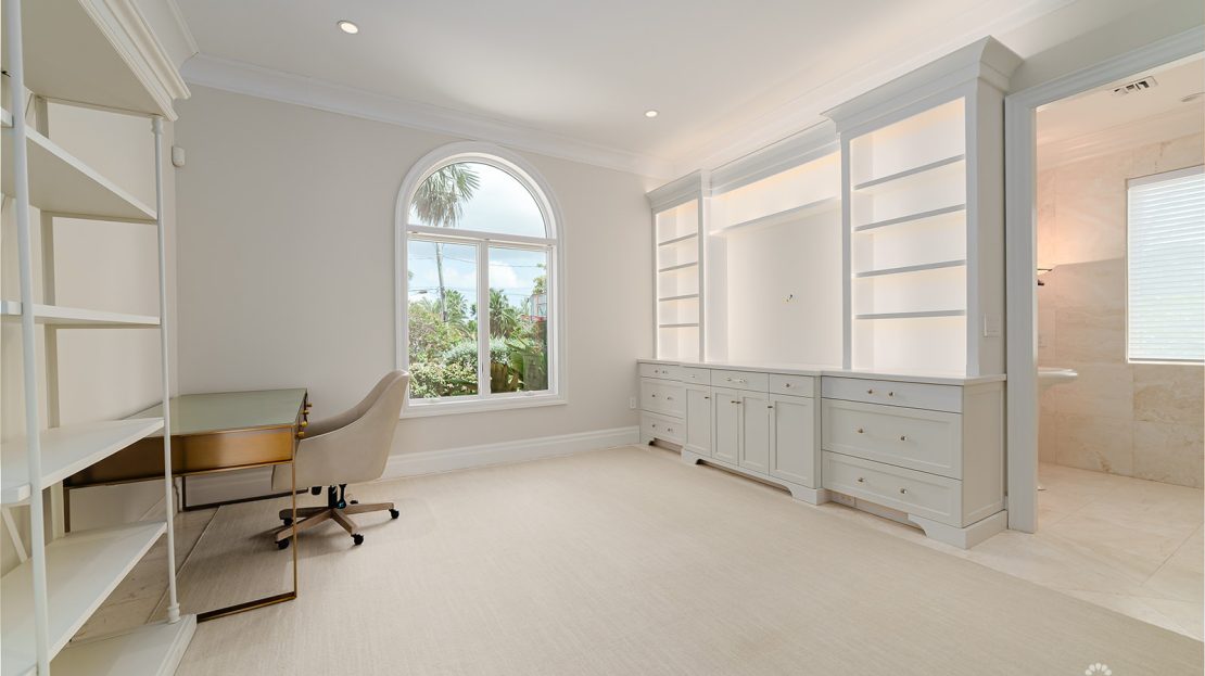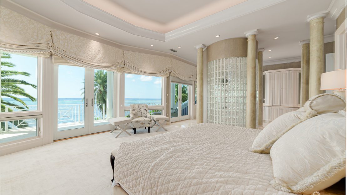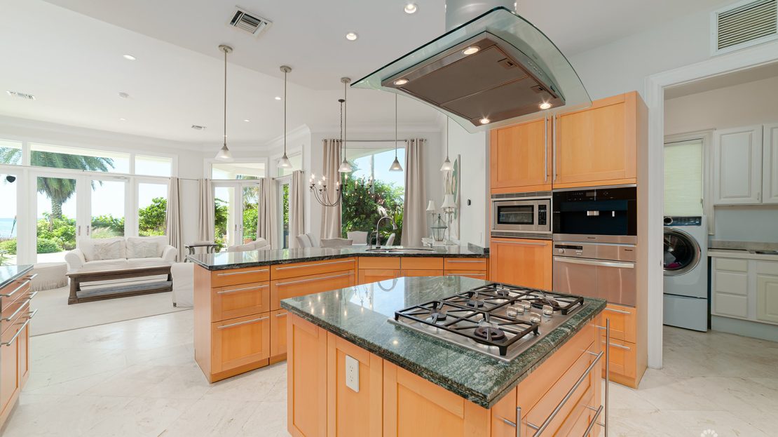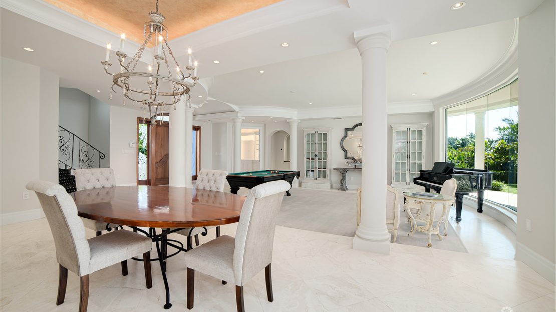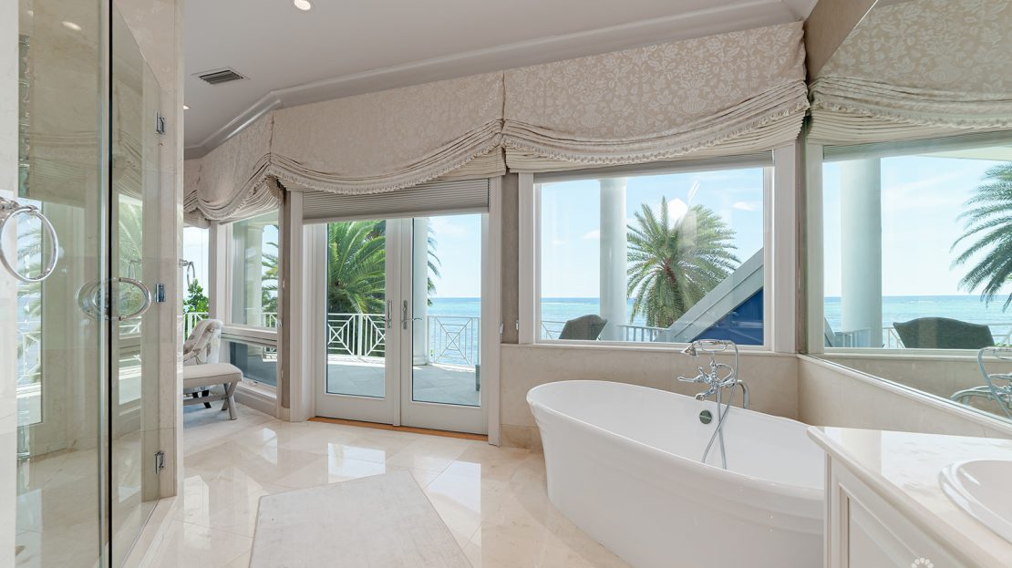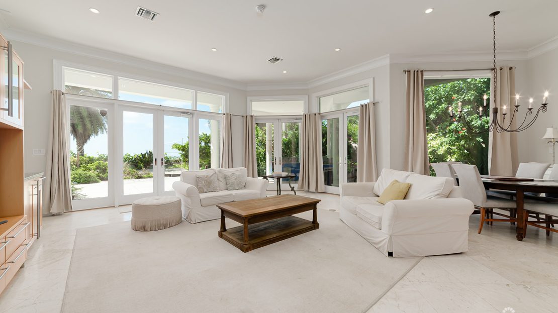 Inside, the home is bright and open, with floor-to-ceiling windows that frame the ocean from nearly every room. Select areas feature 15-foot ceilings, adding to the sense of space and natural light. The layout balances formal and casual areas, creating a comfortable flow between spaces for both everyday living and hosting.