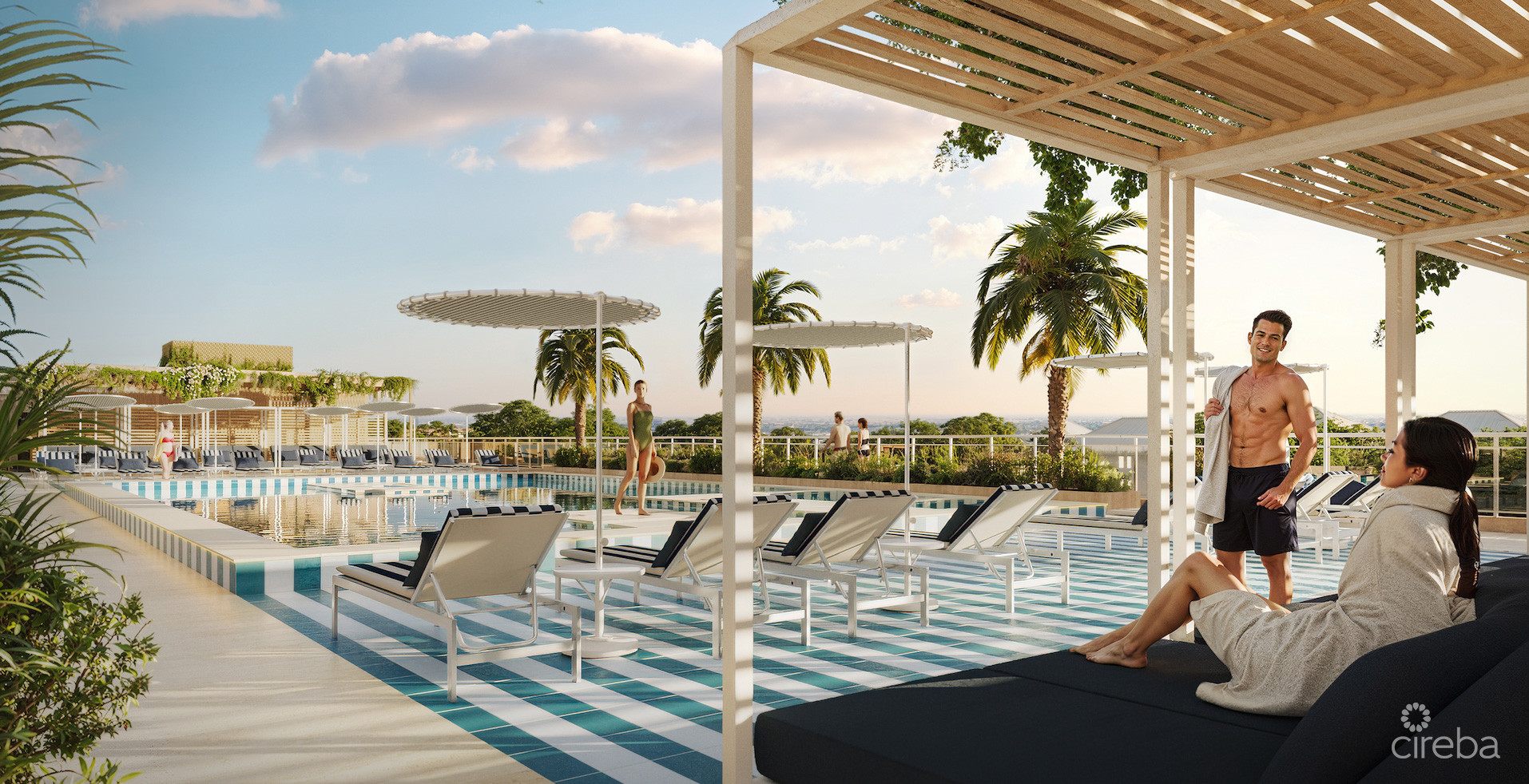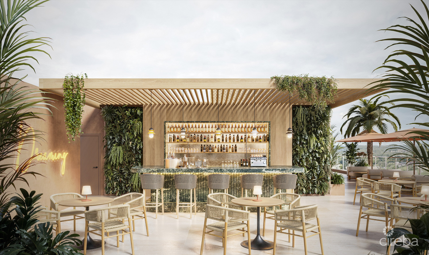 One of The Grove Too’s standout features is its private rooftop terrace, spanning the entire west building and offering breathtaking views of the Caribbean Sea and North Sound. This elevated sanctuary includes a resort-style pool and hot tub, sauna and steam cabins, and a meditation garden with daybeds and hammocks for ultimate relaxation. Residents will also enjoy entertainment areas for children, gathering spaces for social events, and a full-service rooftop bar with a limited food menu—an unparalleled amenity package that truly sets this development apart.